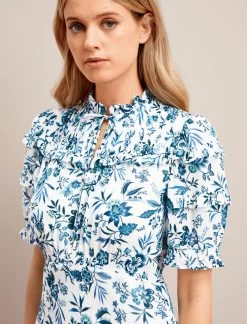 Viola Cotton Blend Bias Cut Maxi Dress – White Blue Palm Floral