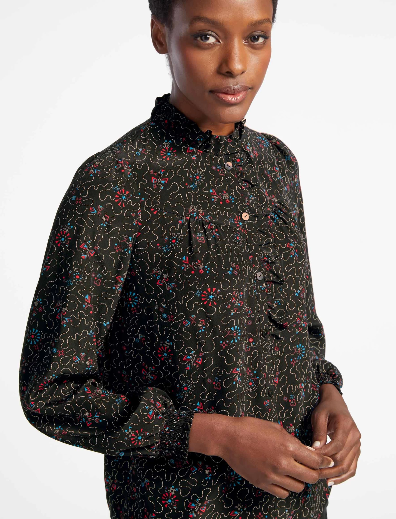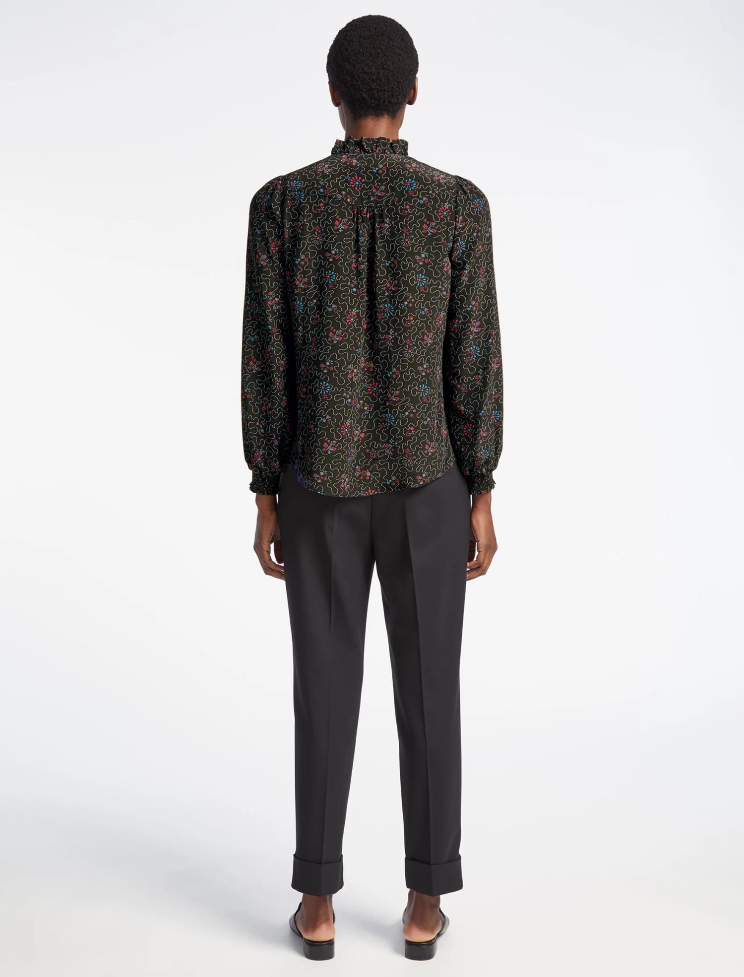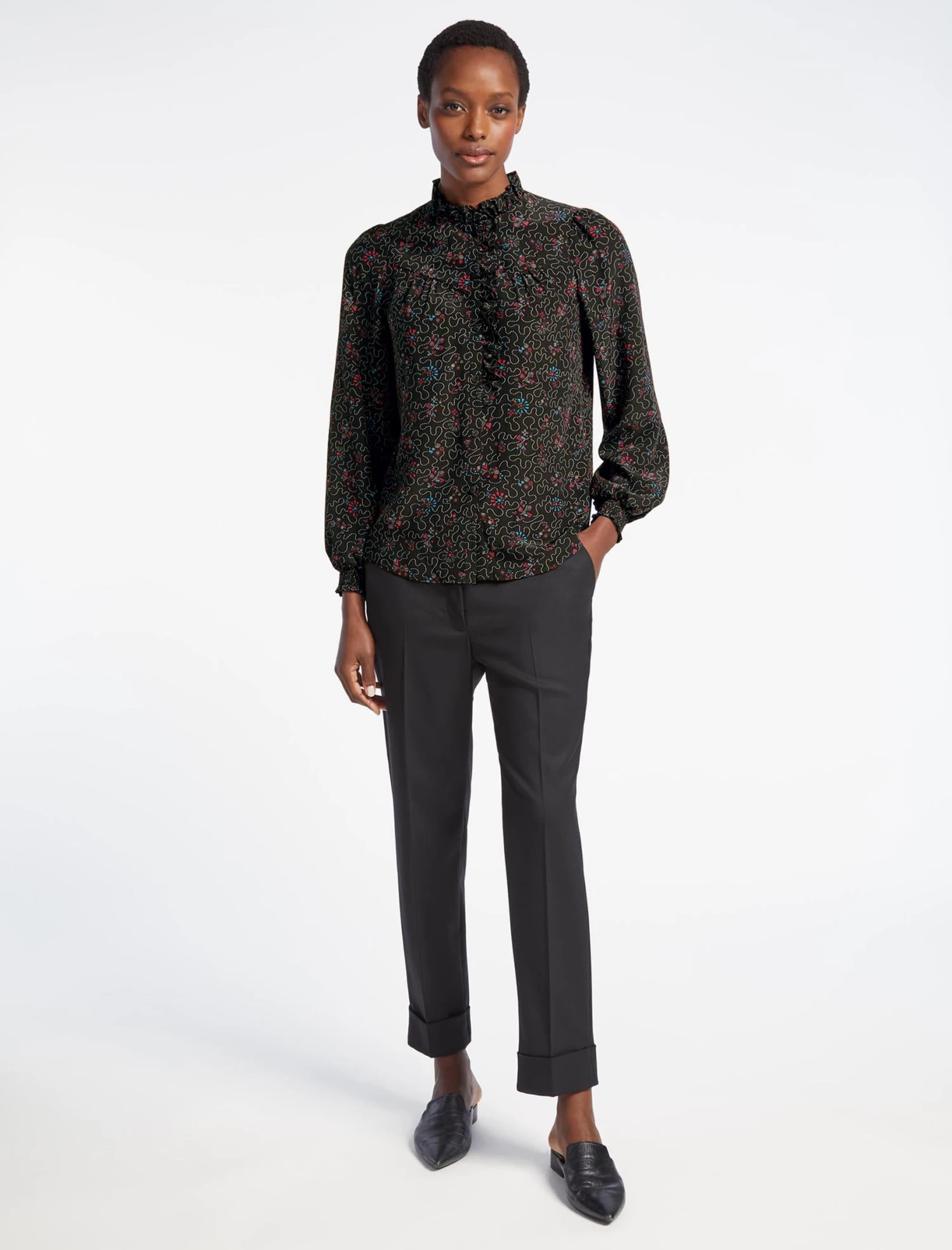 Designed in 100% silk and printed with our graphic wiggle design, Amelie has your spring wardrobe covered. With elegant details including the high frill collar, shoulder ruffles, eyelash cuff edging, you can afford to keep the rest of your styling simple – cue a smart jean or tailored trouser and a pointy heel.