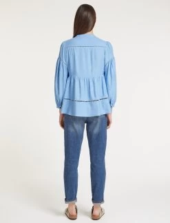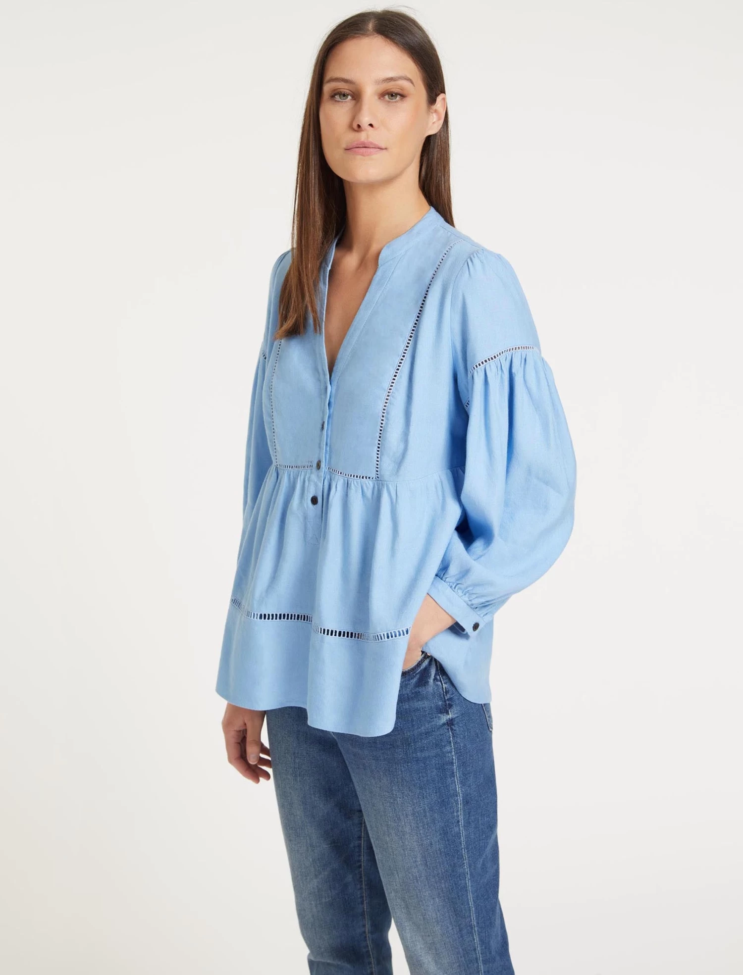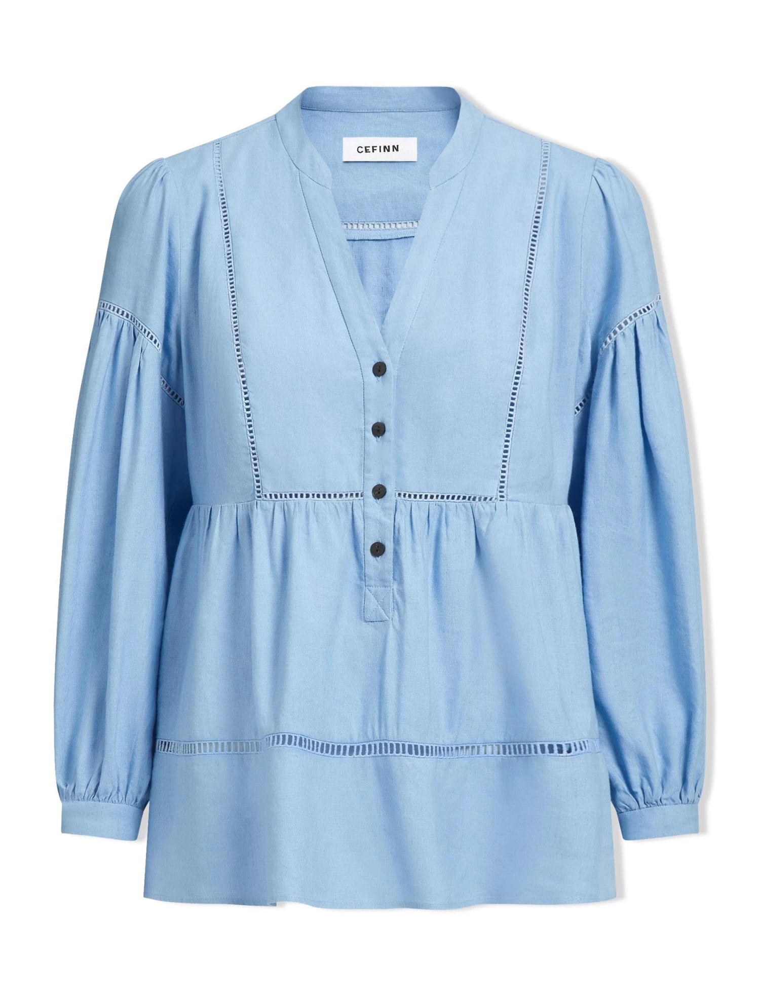 A light and airy addition to your wardrobe, our long-sleeved Callie shirt is designed in a machine-washable linen blend (a first for Cefinn) in blue and white colourways. A modern take on a peasant top, it has pretty ladder trims, our signature blouson sleeves and a loose peplum. Wear with the matching Callie shorts for the ultimate in ‘just rolled out of bed’ chic.