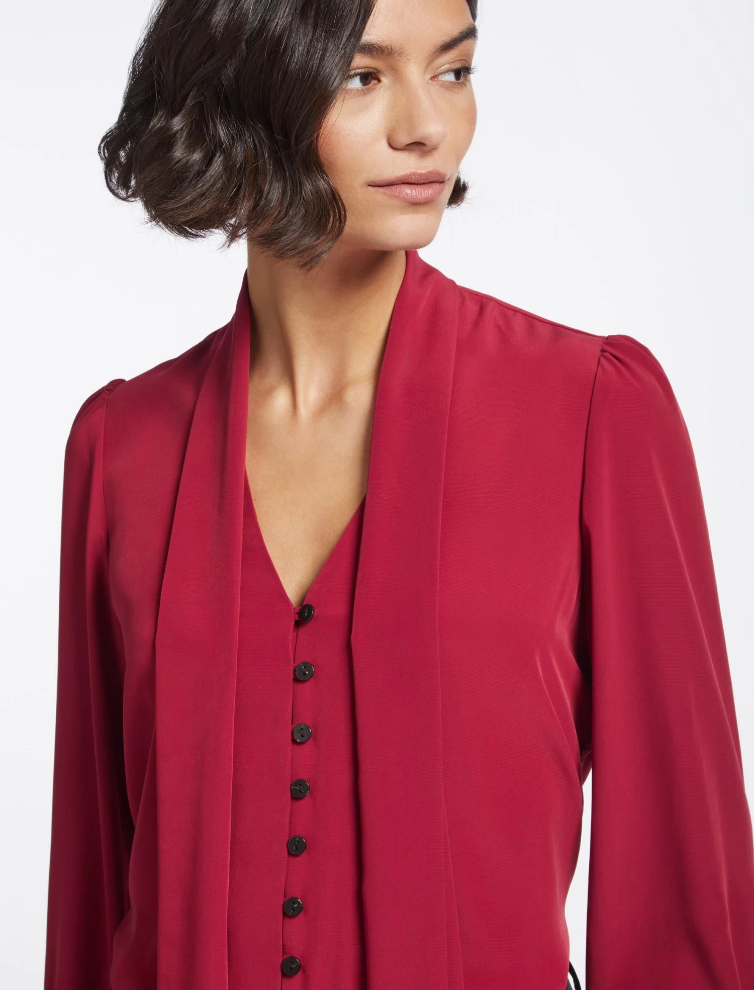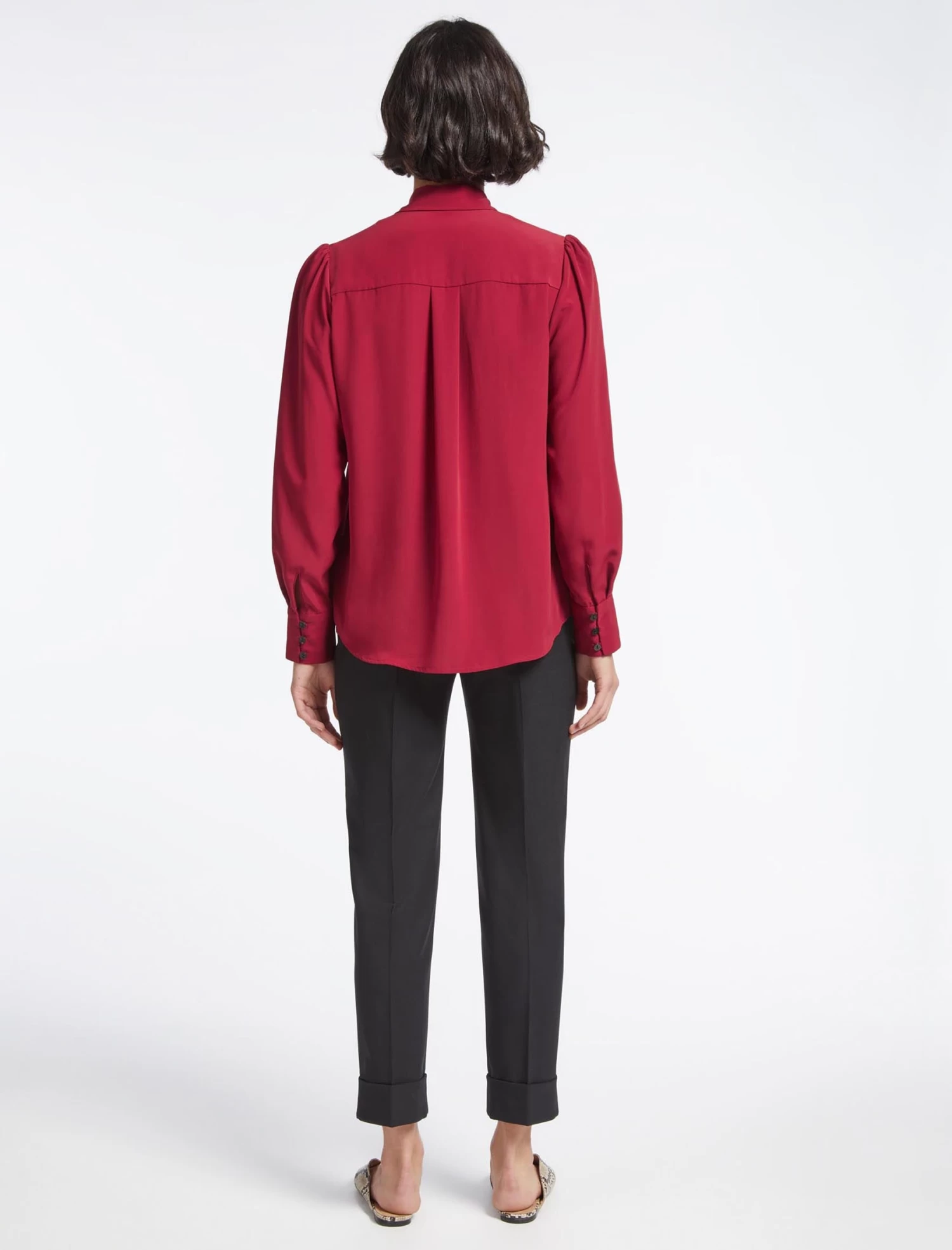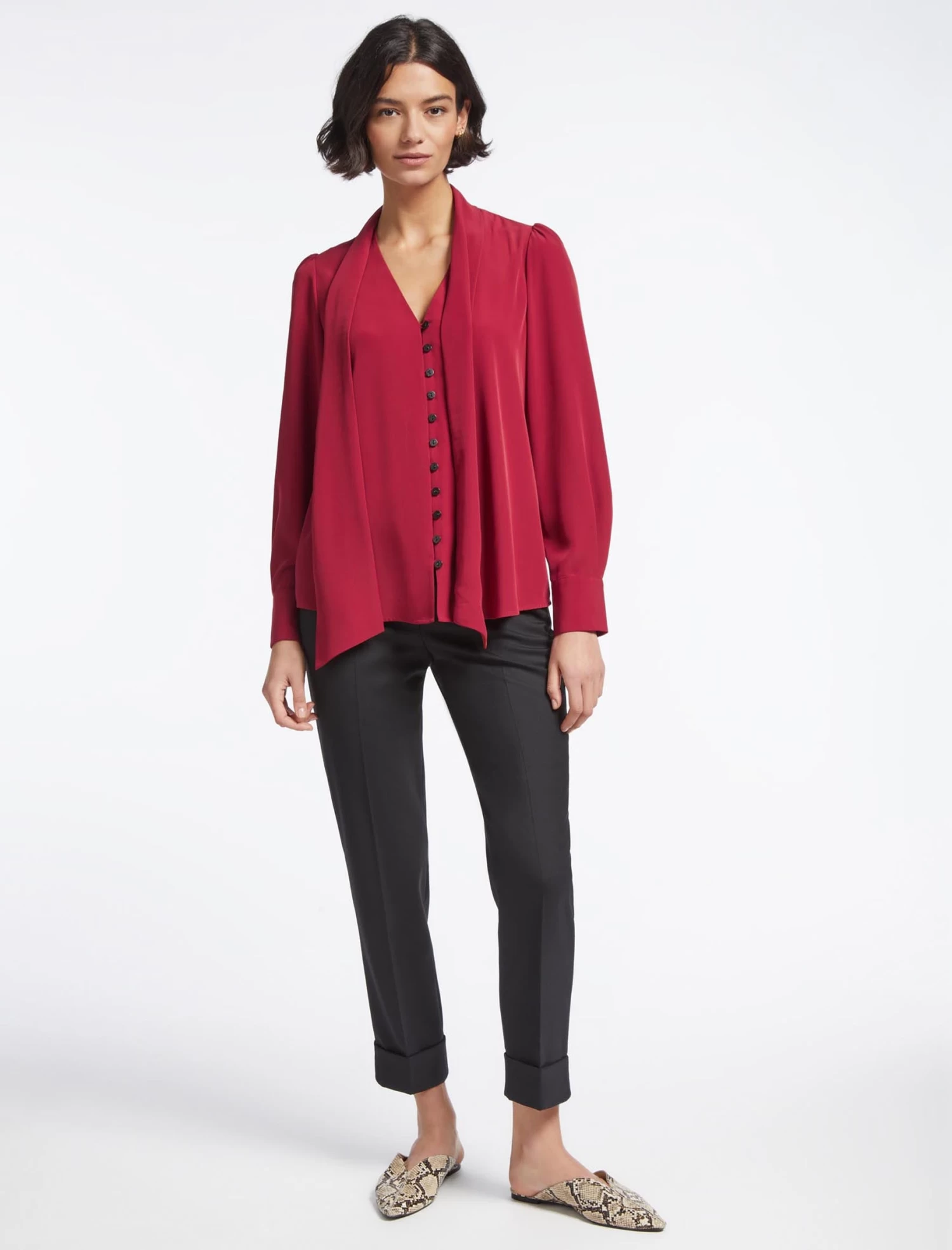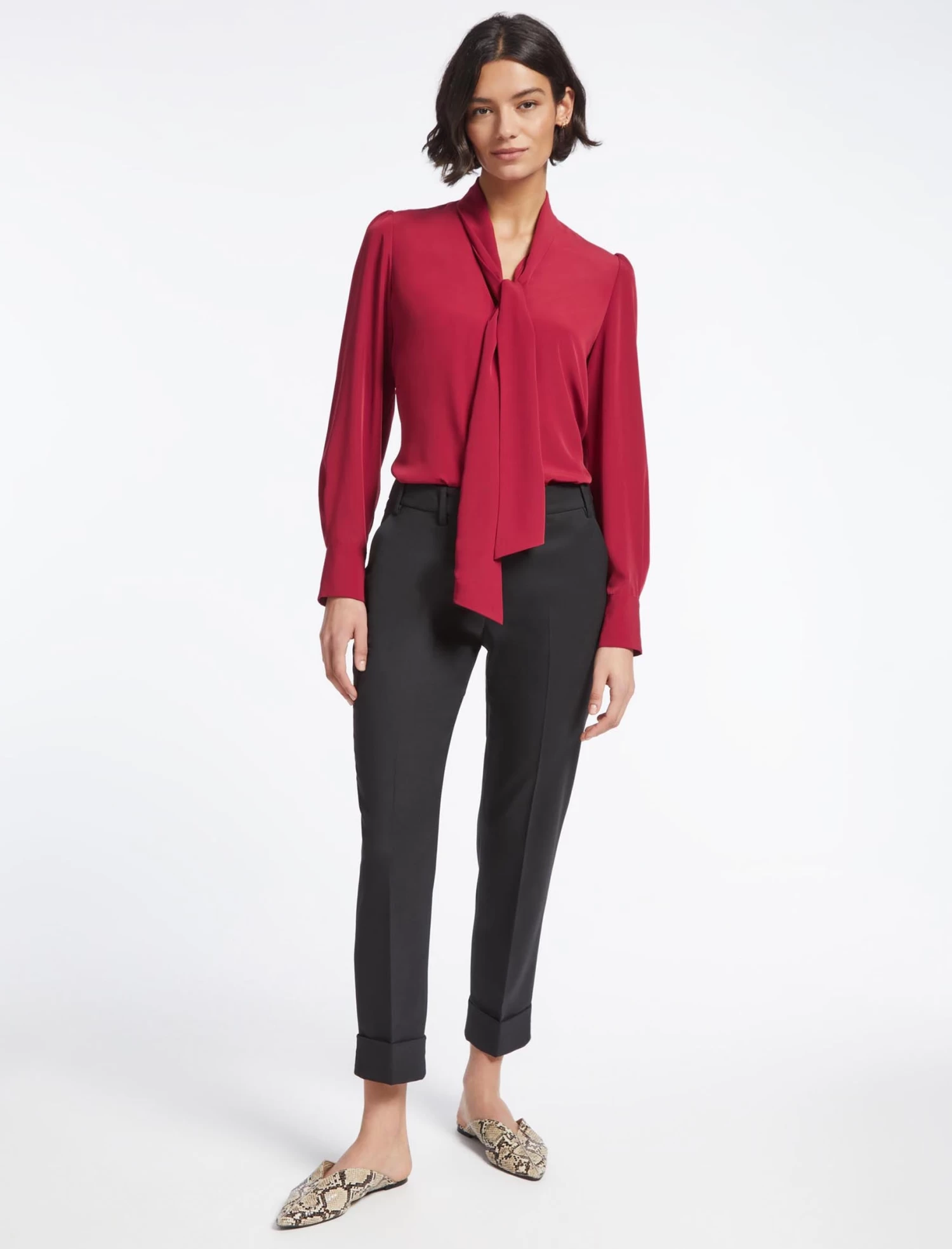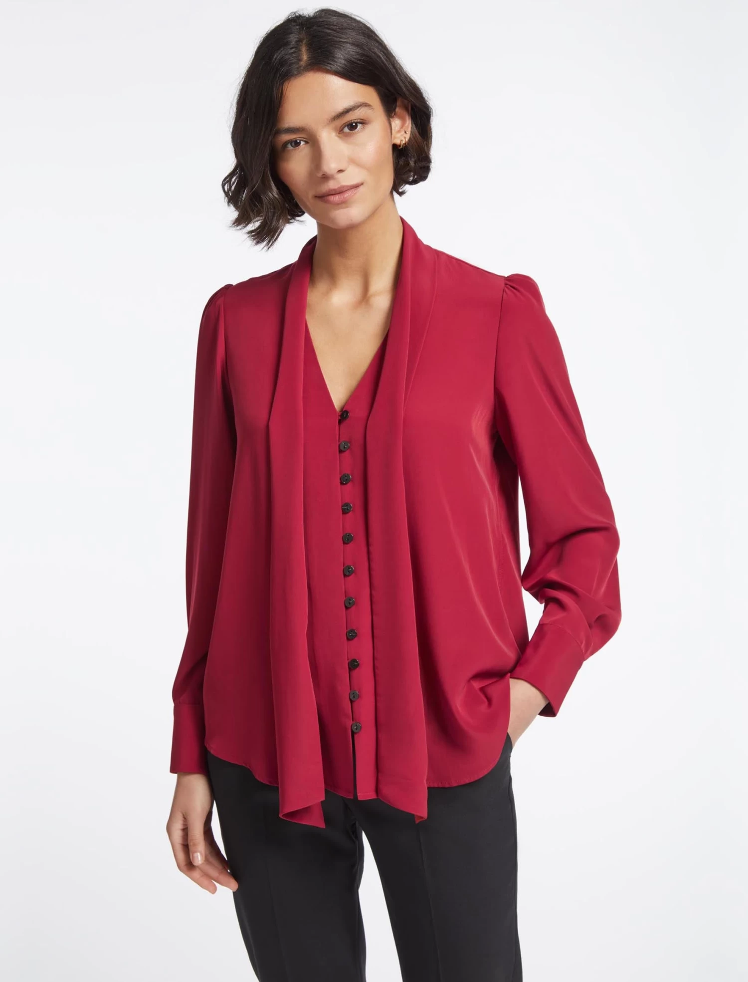 With a renewed focus on tailoring this season, our long-sleeved Carla blouse brings a feminine twist to suiting, thanks to its V-neck, rouleaux summarys and tie scarf. Designed in a Techni crepe-de-chine, which has the look and feel of a washed silk but is machine washable, it’s an ideal addition to your desk-to-dinner wardrobe.