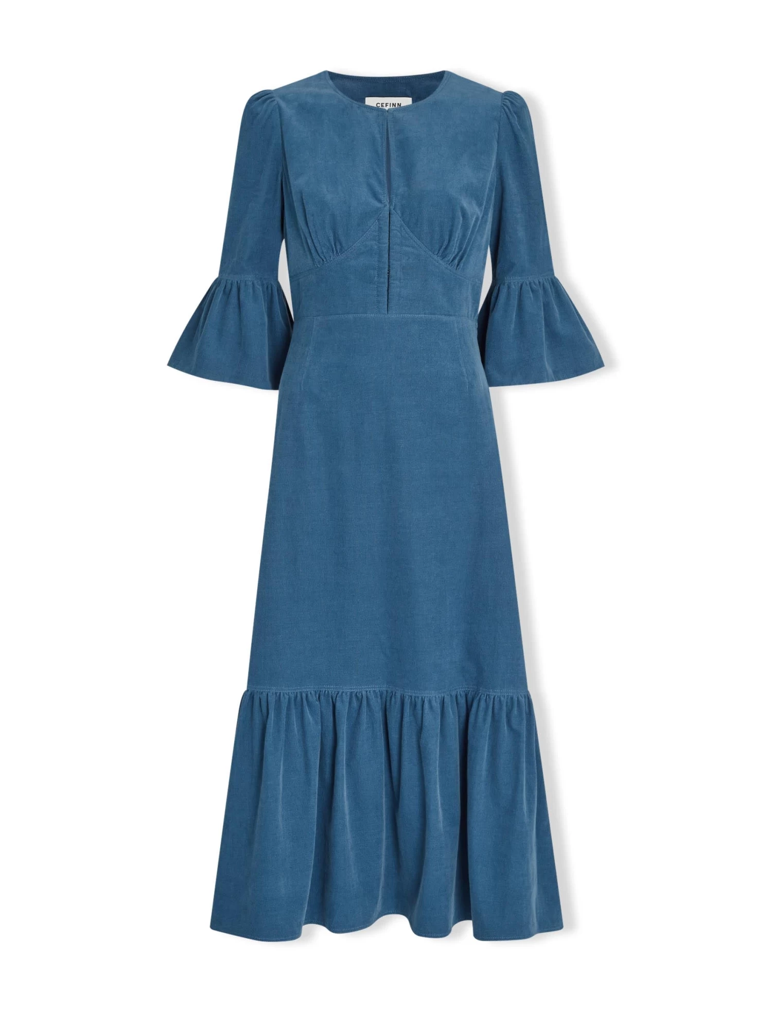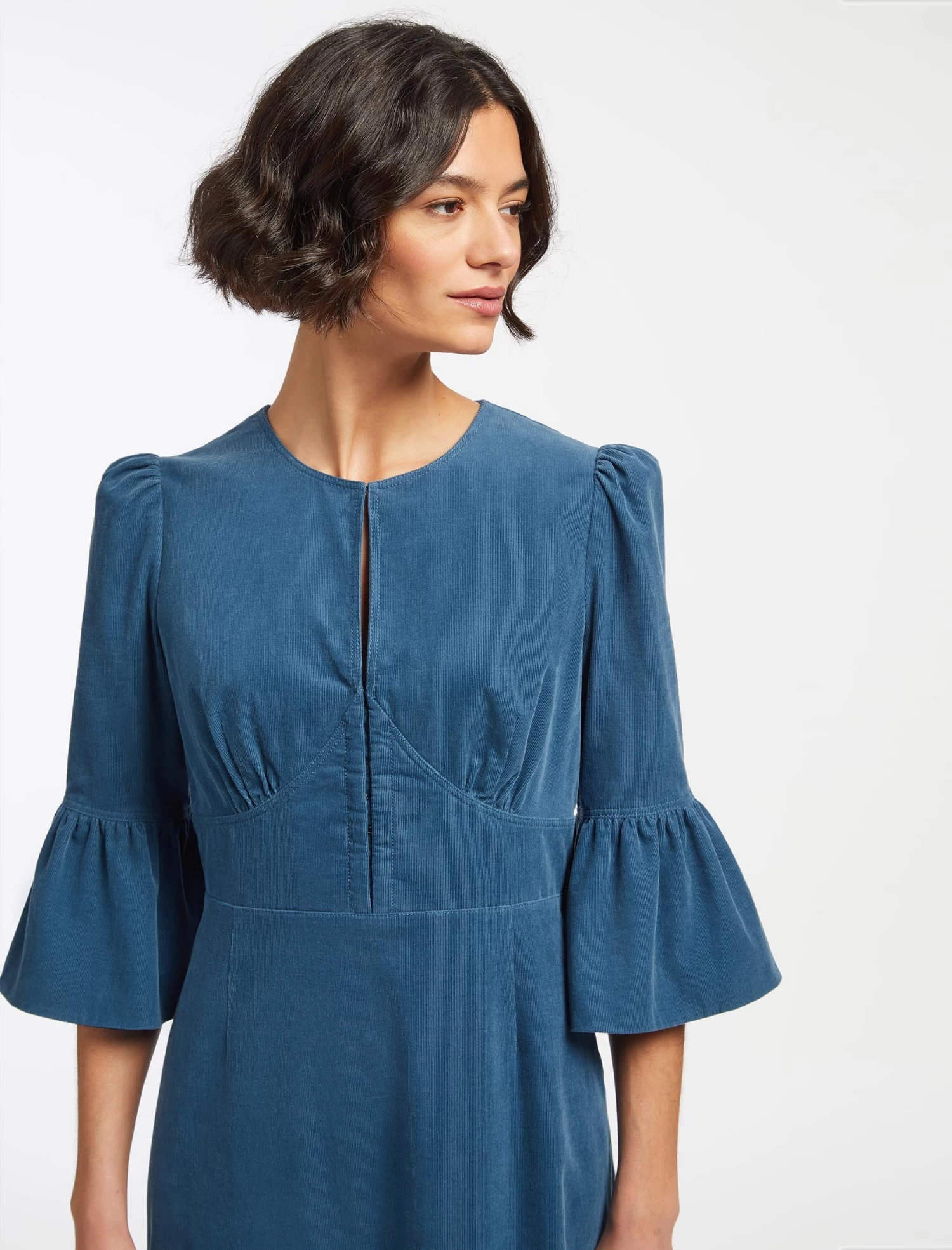 - Fitted to bust and waist, loose over hips with 3/4 length fluted sleeves.