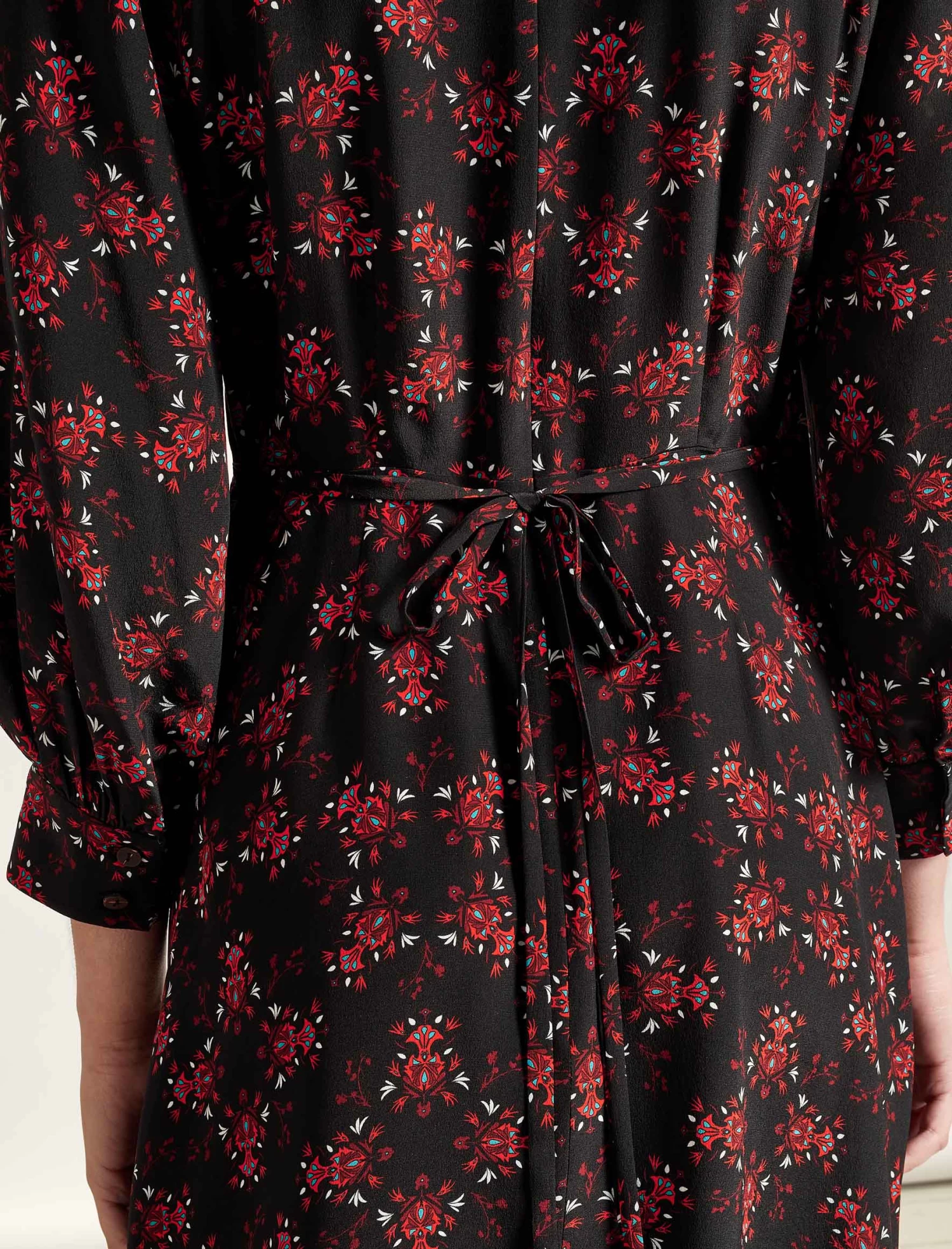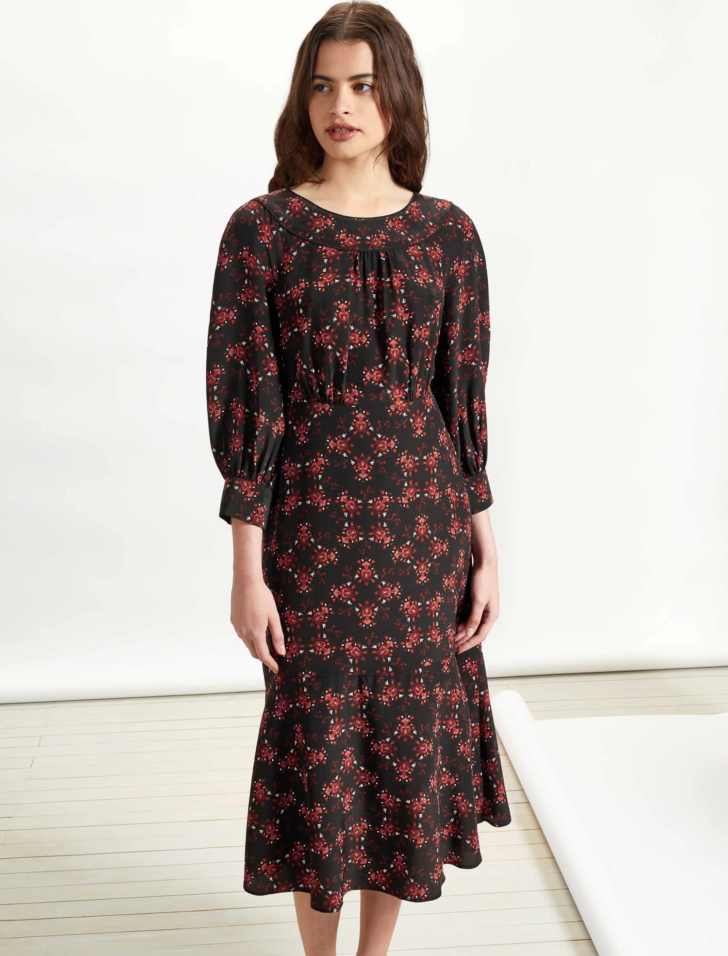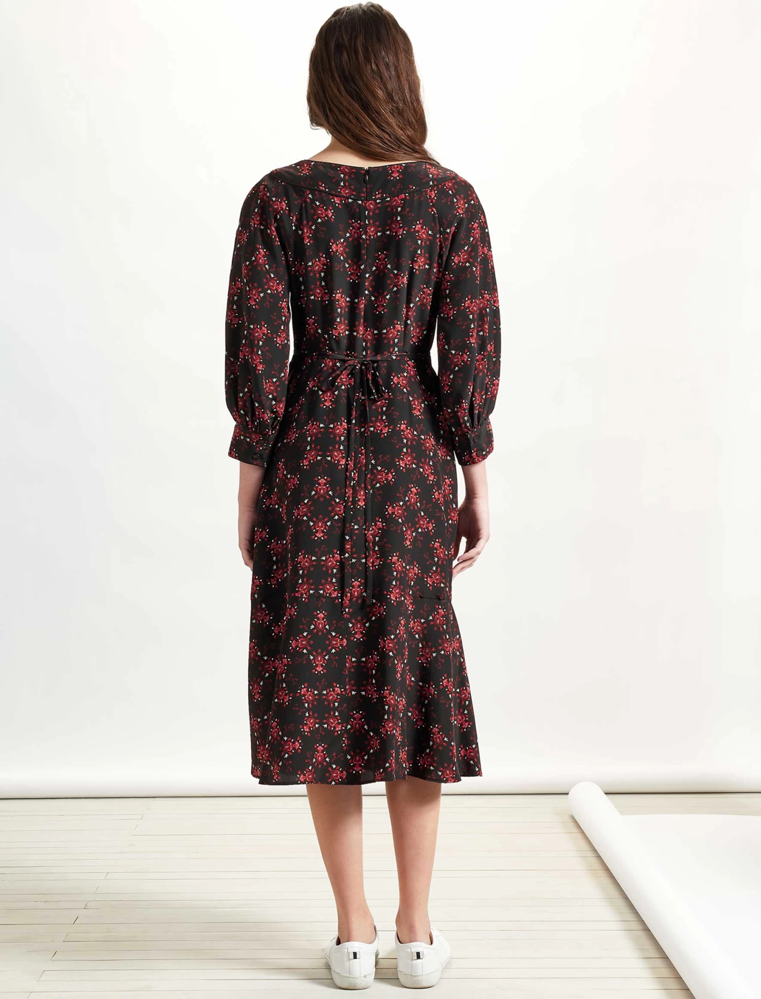 The Darcie Dress in 100% silk crepe de chine is a universally flattering style. The waist has an easy fit that can be nipped in with rouleau ties at the back, whilst the bracelet length, blouson raglan sleeves and peplum cut of the midi-length skirt work whatever your height or shape. The overlapping slits at the side skirt flare out as you walk, and in our eye-catching graphic Floral Print, this dress looks as prairie pretty with boots or heels as it does with trainers or flats.