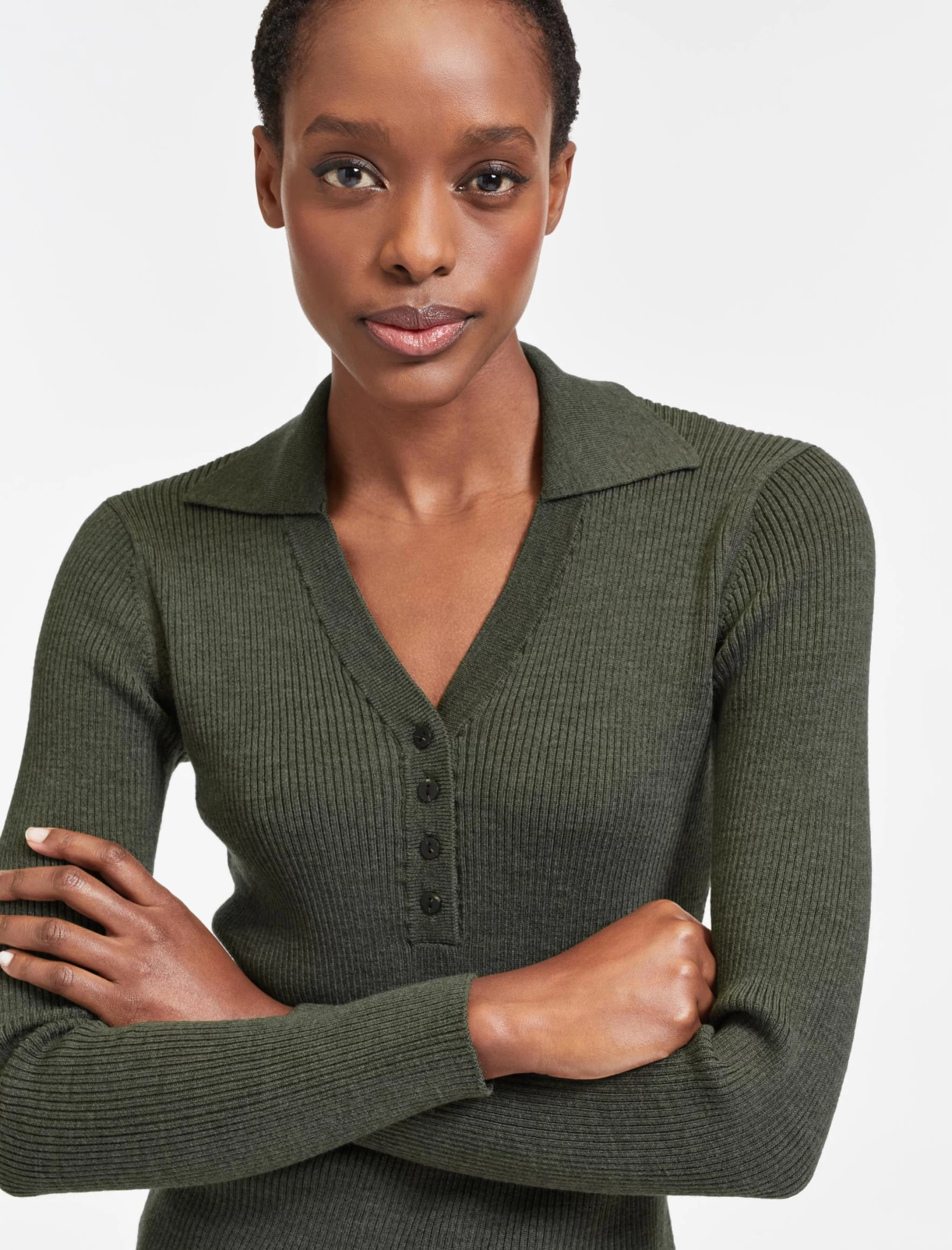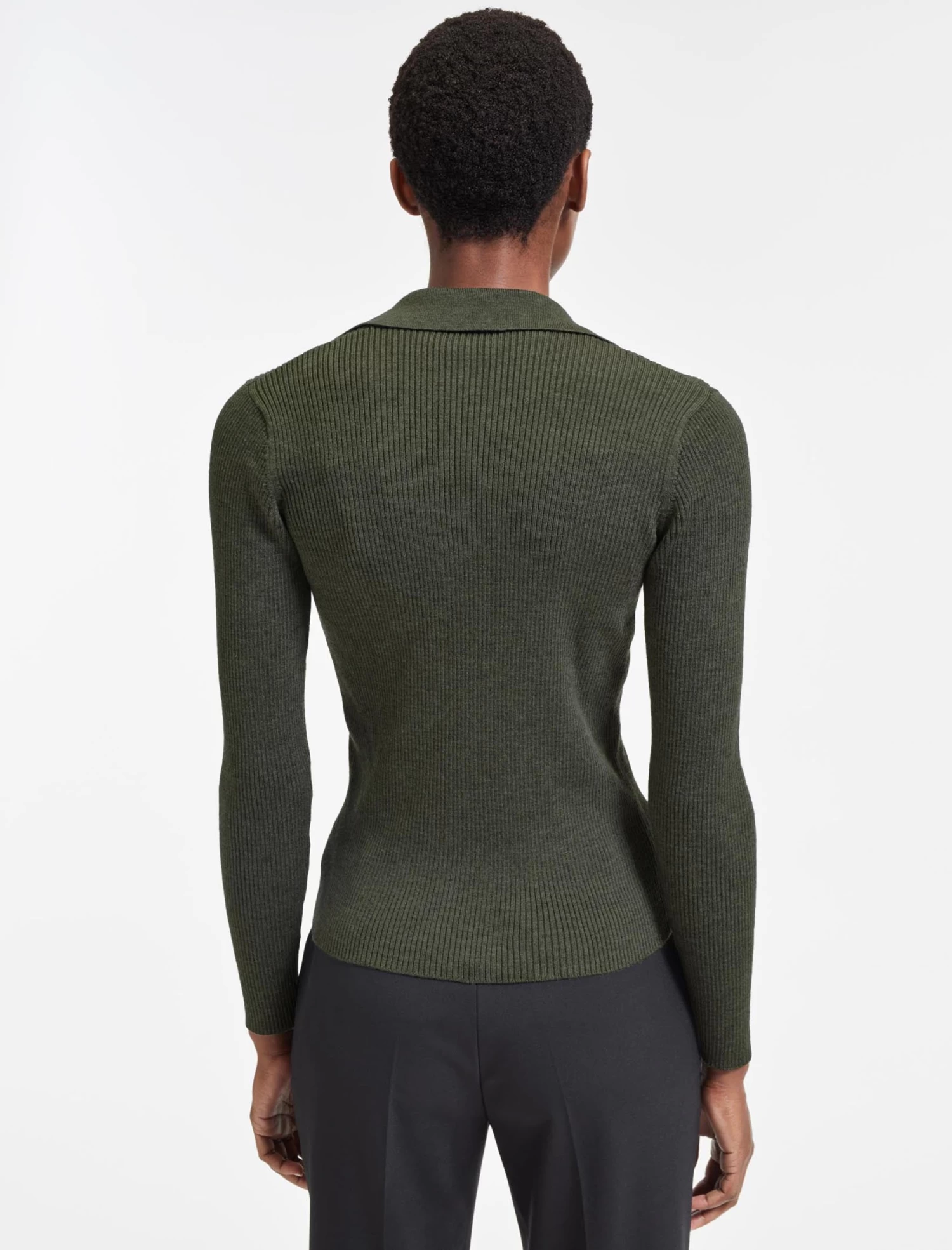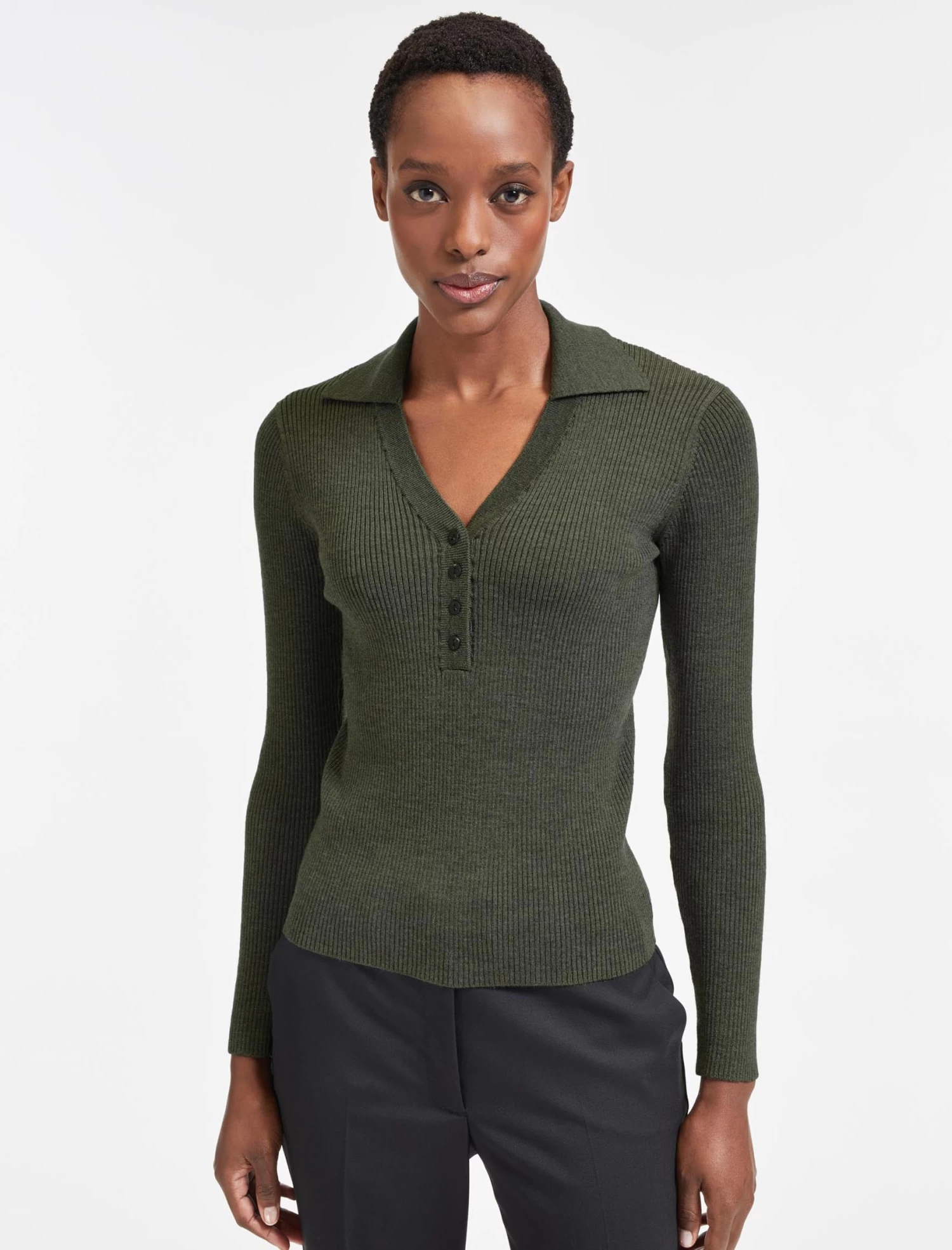 With a vintage style V-neck collar, our latest figure-flattering merino rib jumper will instantly upgrade your wardrobe staples. Adding polish and sophistication to any look, it has casual chic down to a (long-sleeved) tee.