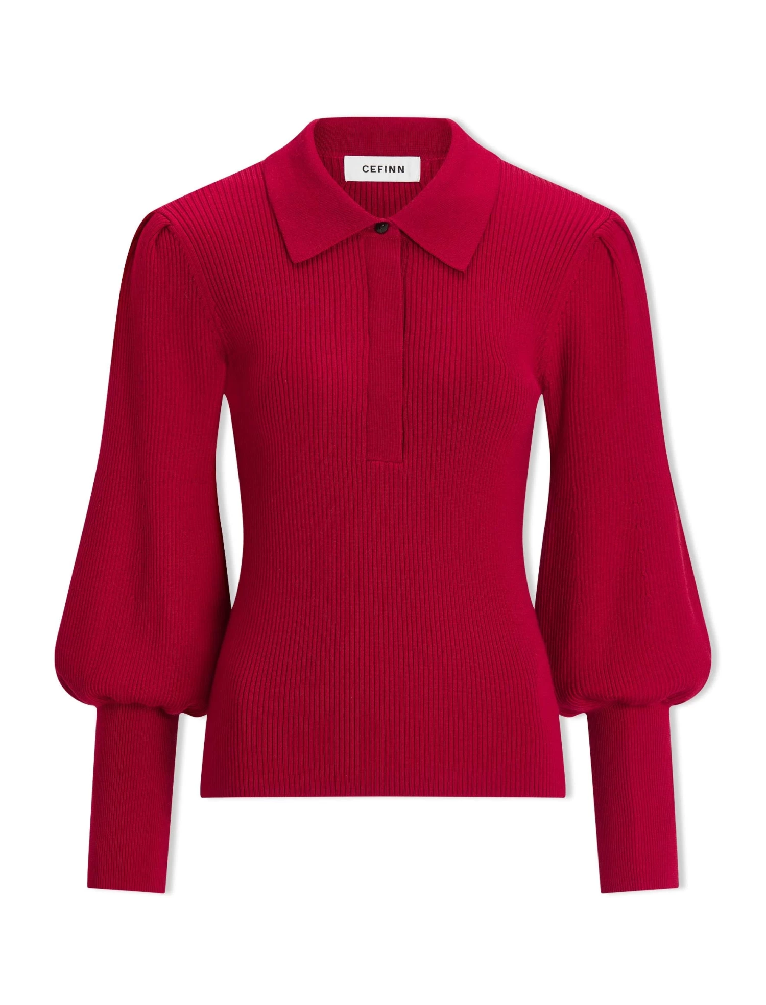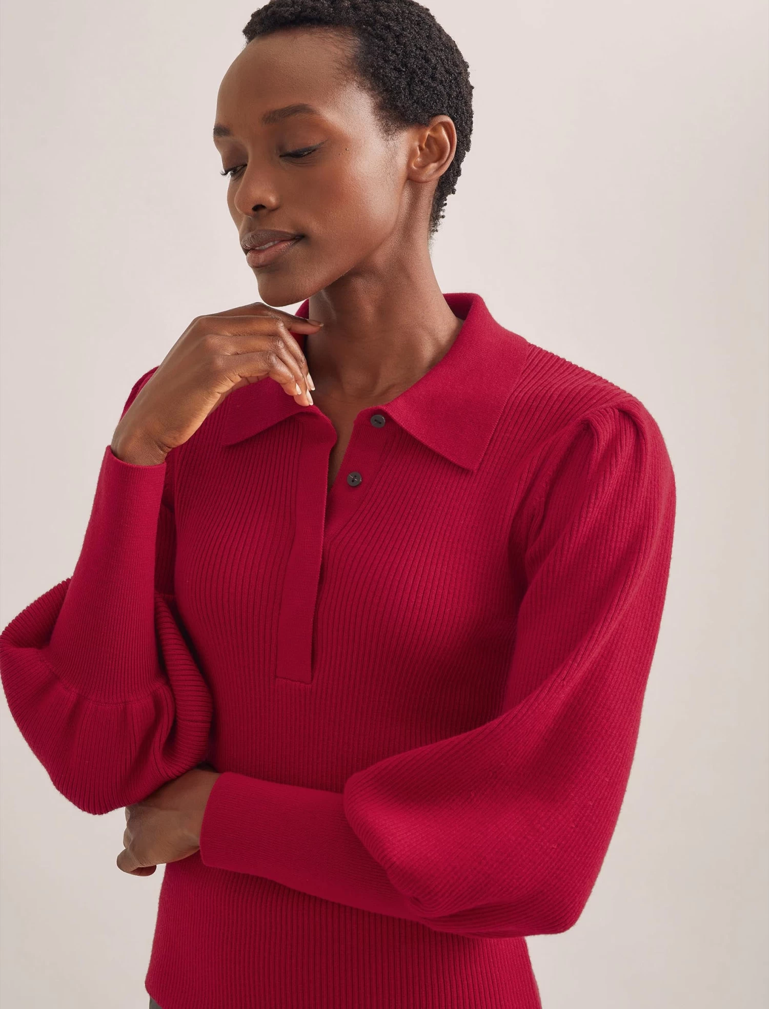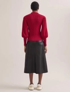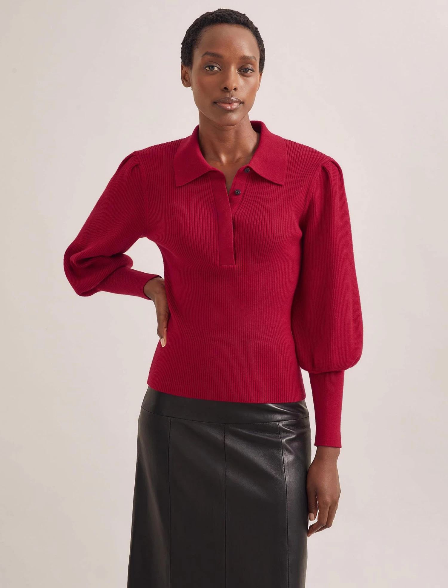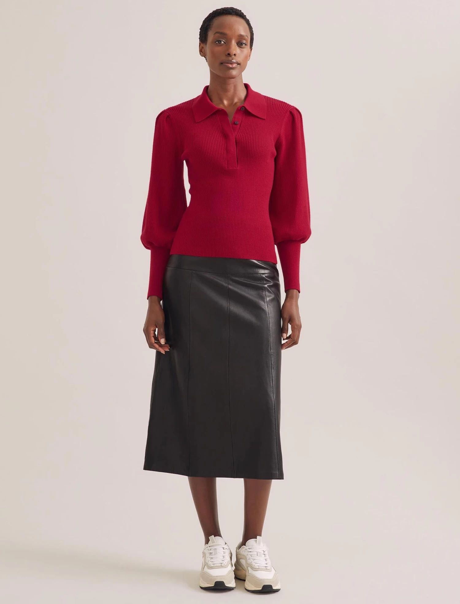 We’ve reworked our hero Eva top for FW23 with a polo-style neckline for effortless versatility. It’s designed in a soft merino-wool rib with added stretch to create a slimming silhouette, while the fitted cuff blouson sleeves add shape and volume. The perfect knit for when you want to feel pulled together, wear it with our leather Tiana skirt or any of our tailored trousers.