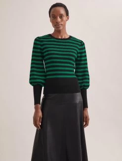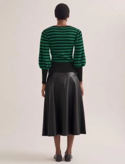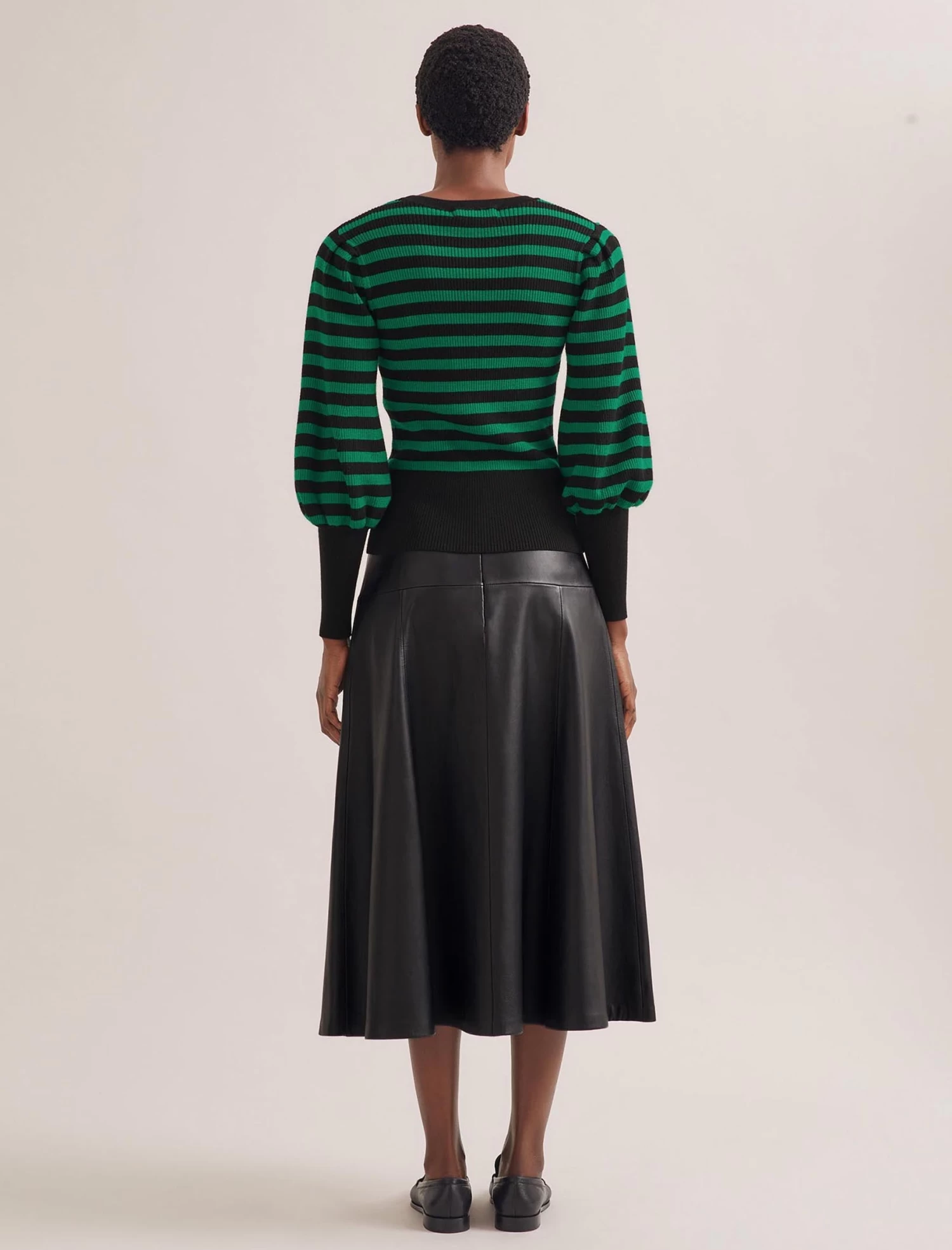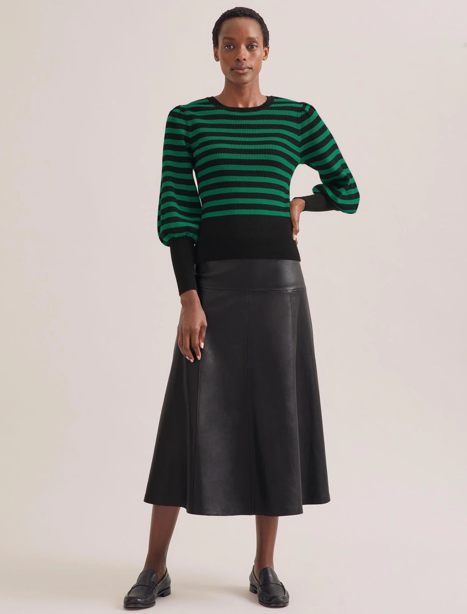 We’ve reworked our hero Eva style with a classic crew neckline for effortless versatility. The merino rib creates a slimming silhouette, while the fitted cuff blouson sleeves add feminine shape and volume. The ultimate pulled together knit, the Eva is the perfect alternative to a jacket and shirt. Wear with our leather Tiana skirt or any of our tailored trousers.