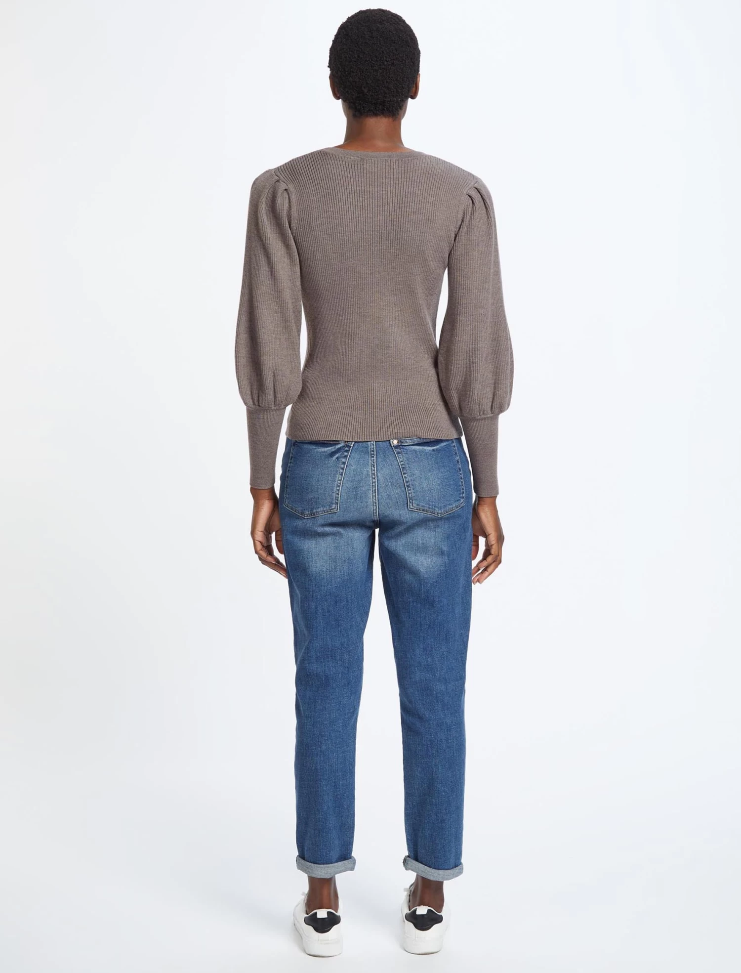 We’ve reworked our hero Eva style with a classic crew neckline for effortless versatility. The merino rib creates a slimming silhouette, while the fitted cuff blouson sleeves add feminine shape and volume. The ultimate pulled together knit, the Eva is the perfect alternative to a jacket and shirt. Wear with our leather Tiana skirt or any of our tailored trousers.