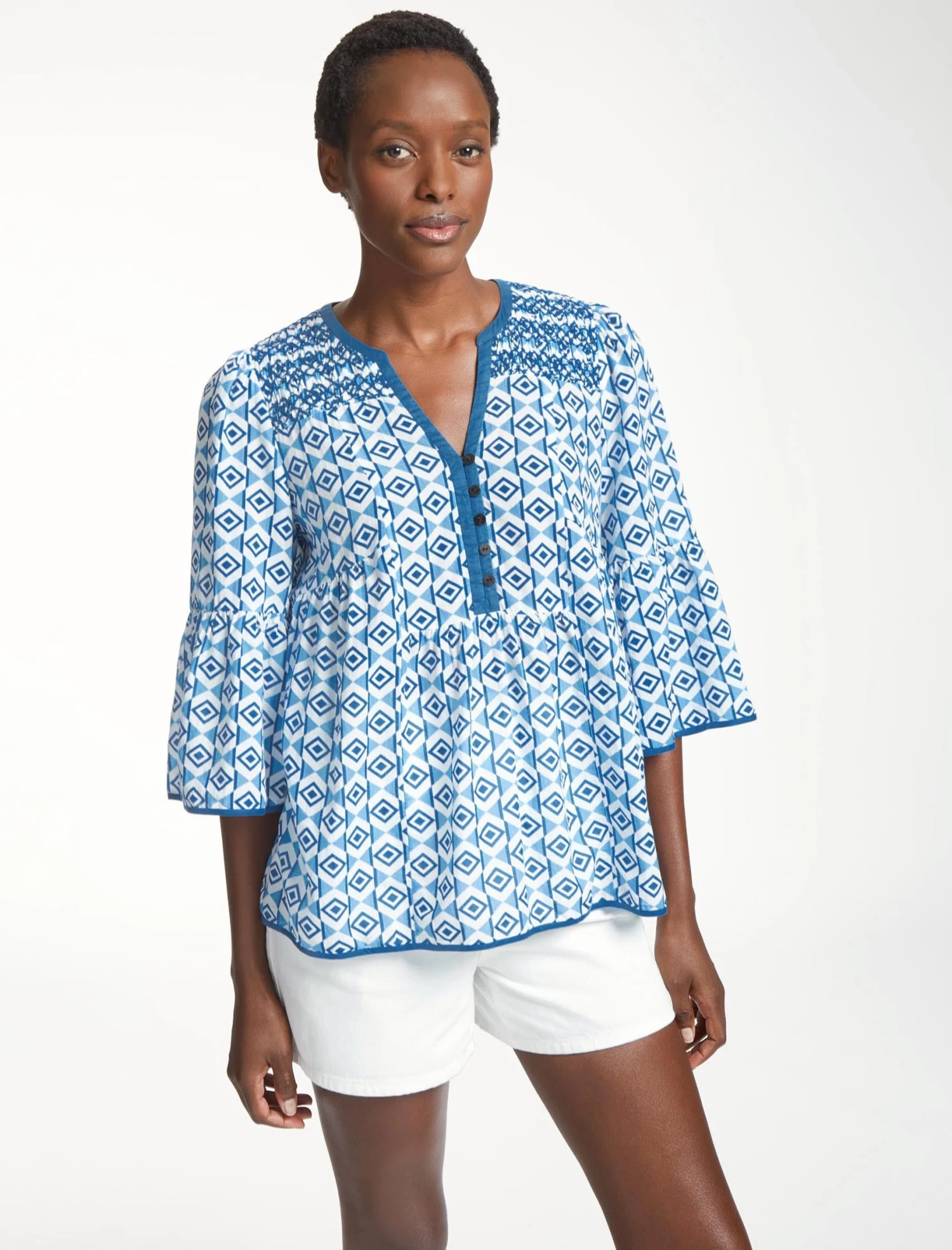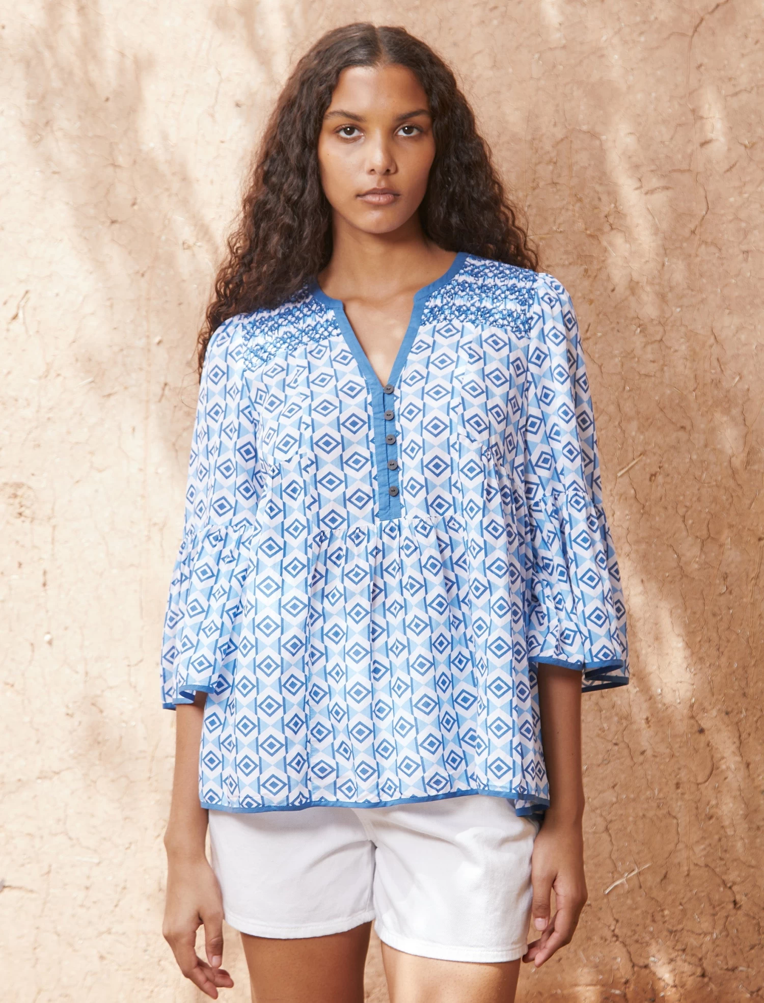 A relaxed top for easy summer days, our Hester blouse takes its design cues from peasant tops. Made from a cool cotton blend with our graphic geo print and hand-embroidered smocking detail, it has effortless elegance written all over it. A cool option for hot days with white denim, cut-offs or over a bikini.