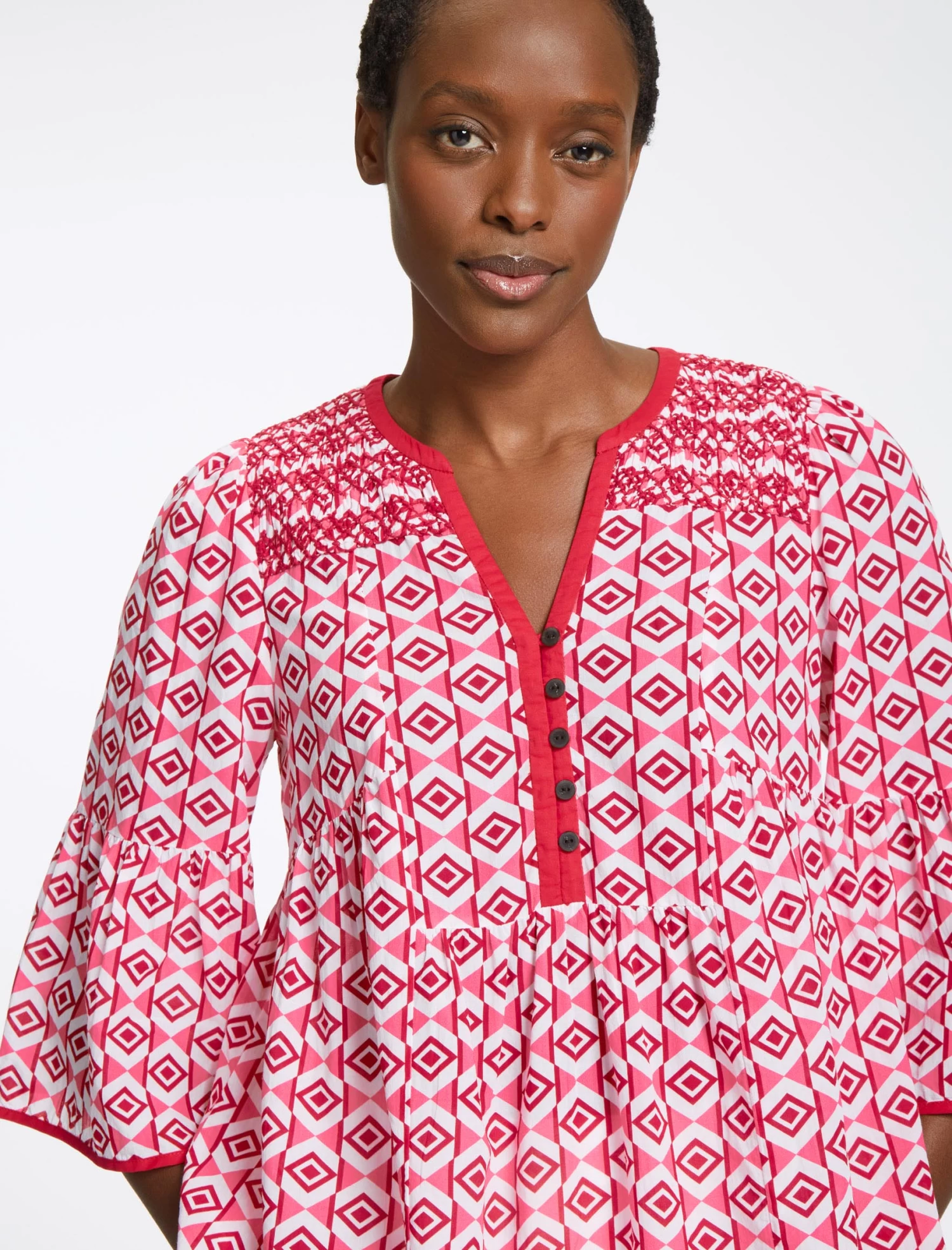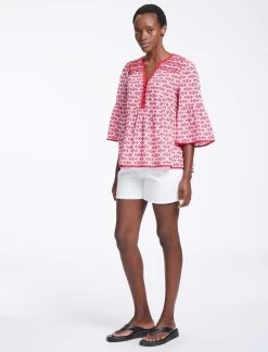 A relaxed top for easy summer days, our Hester blouse takes its design cues from peasant tops. Made from a cool cotton blend with our graphic geo print and hand-embroidered smocking detail, it has effortless elegance written all over it. A cool option for hot days with white denim, cut-offs or over a bikini.