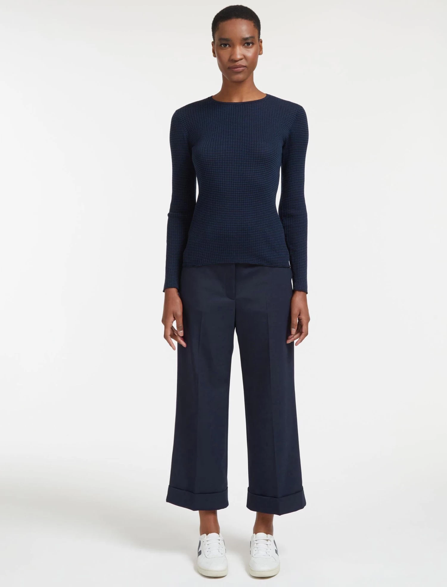 One of our signature crewneck styles, Jackson is a lightweight merino knit with year-round appeal. The clever combination of fine horizontal stripes and a vertical rib ensures it is universally flattering. Ideal for layering under jackets and blazers with a tailored trouser or jean, you’ll be reaching for it time and again.