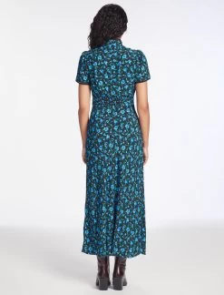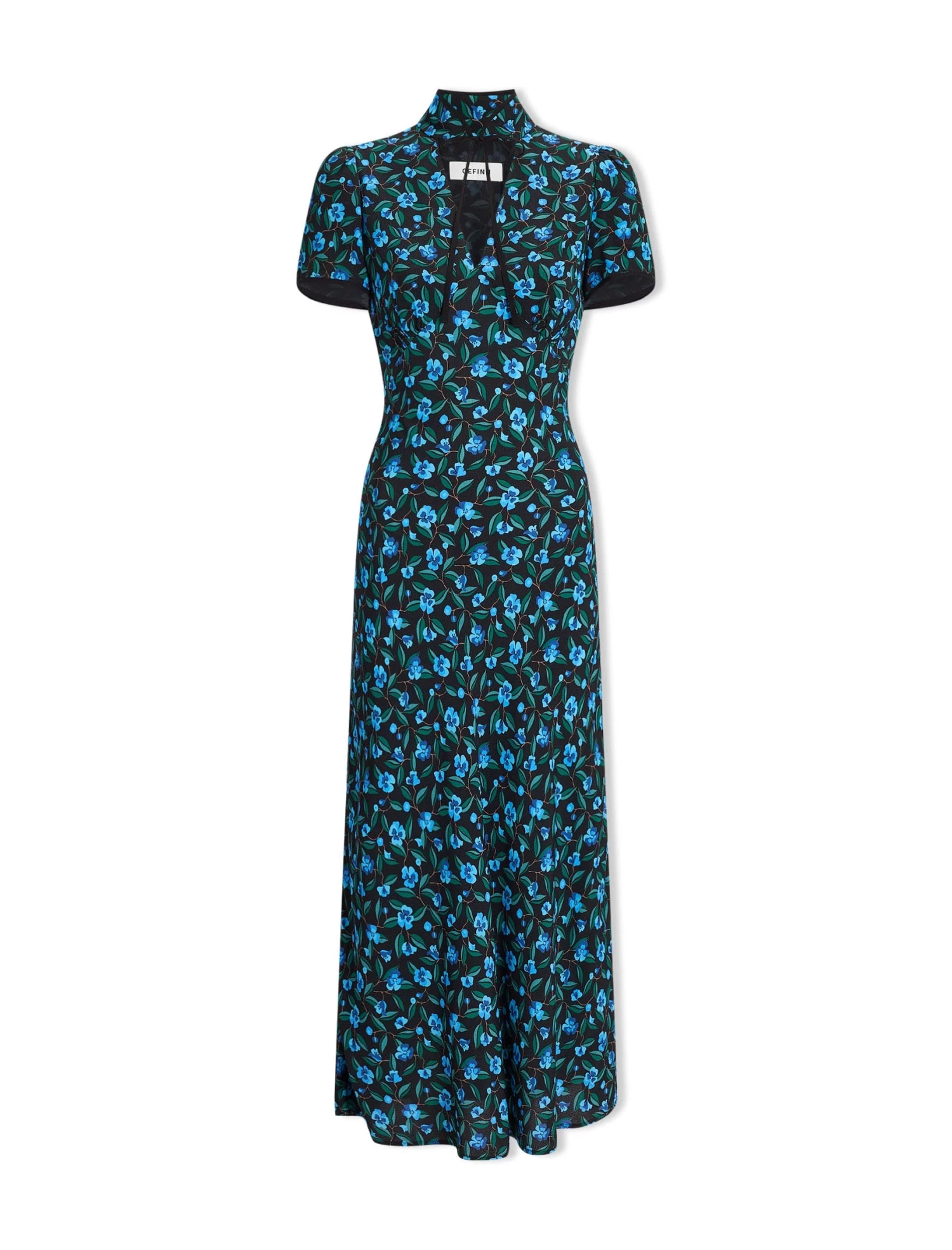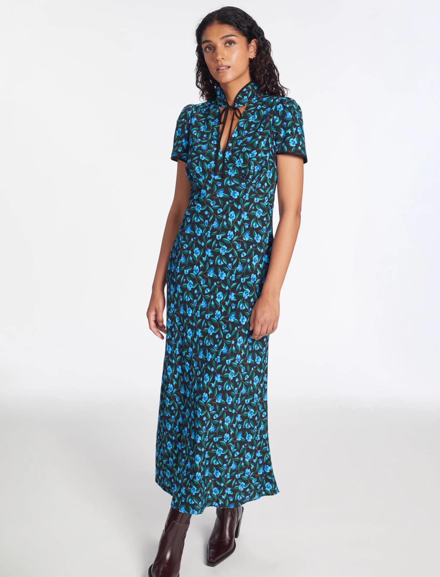 This is a dress with poise and panache. A best-seller from AW22, we’ve revisited Jacquetta in a lightweight viscose crepe with our standout deco floral print. The flattering bias-cut skirt, short sleeves and signature tie collar elevate it for formal events. A late summer show-stopper, add a dramatic flourish with a strappy heel and a striking red lip.Â