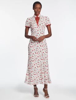 This is a dress with poise and panache. A best-seller from AW22, we’ve revisited Jacquetta in a lightweight viscose crepe with our standout deco floral print. The flattering bias-cut skirt, short sleeves and signature tie collar elevate it for formal events. A late summer show-stopper, add a dramatic flourish with a strappy heel and a striking red lip.Â