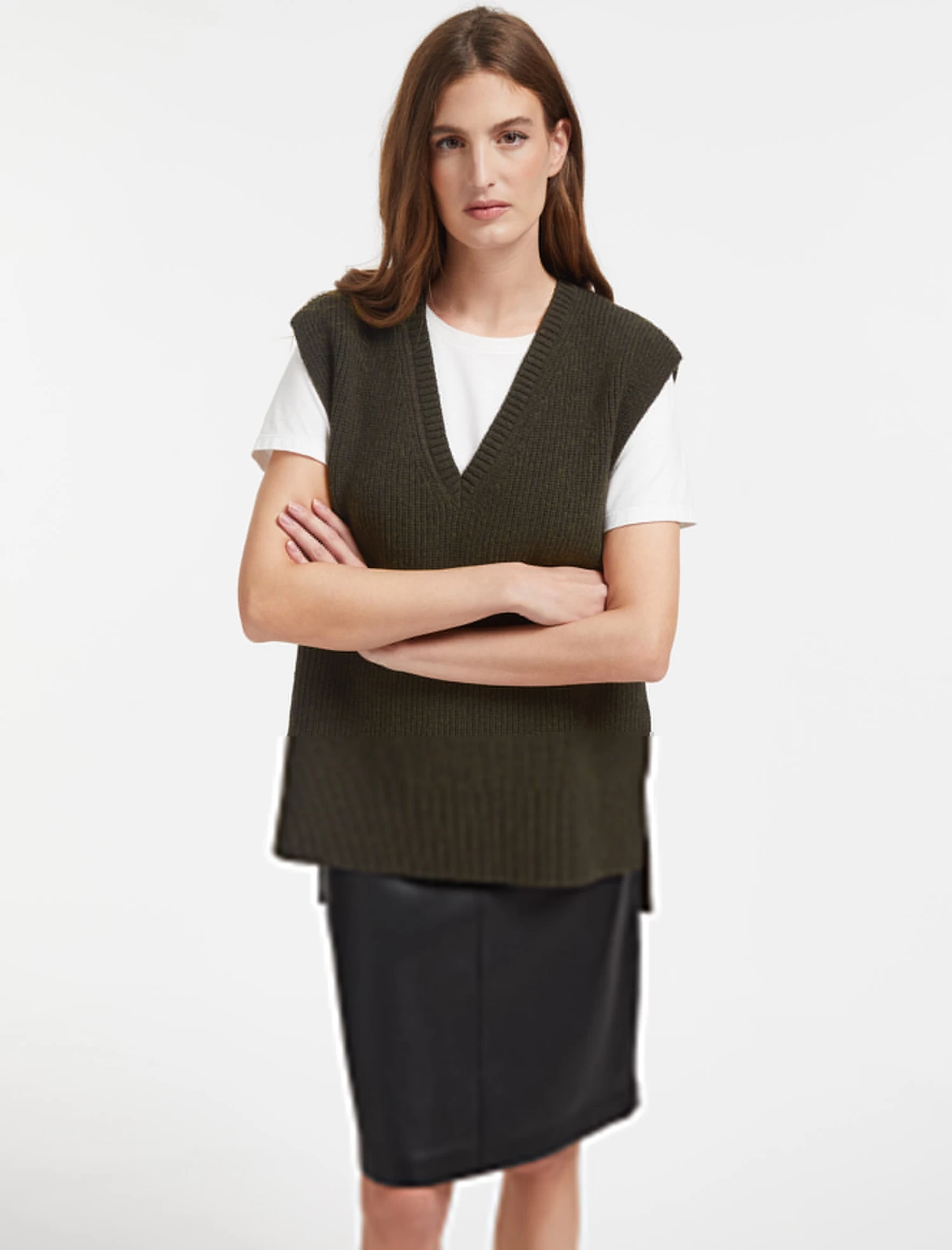 Our V Neck Janice is the ideal layering top when you’re on-the-go. Knitted in a merino wool blend, the drop shoulders, side slits and drop hem mean it will easily layer over a multitude of outfits – from a voluminous dress to an untucked white shirt and wide-leg trouser to a split-hem legging and long-sleeved tee. Talk about the ultimate multi-tasker.
