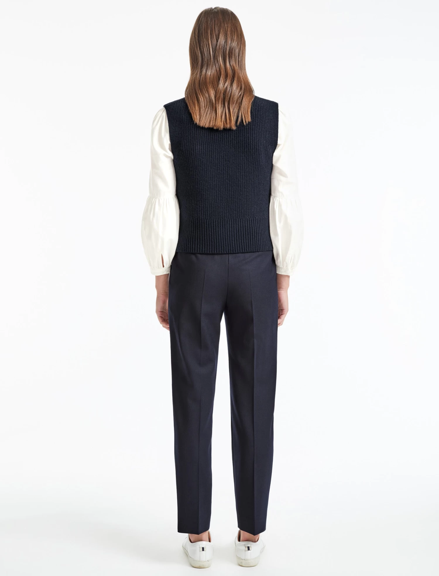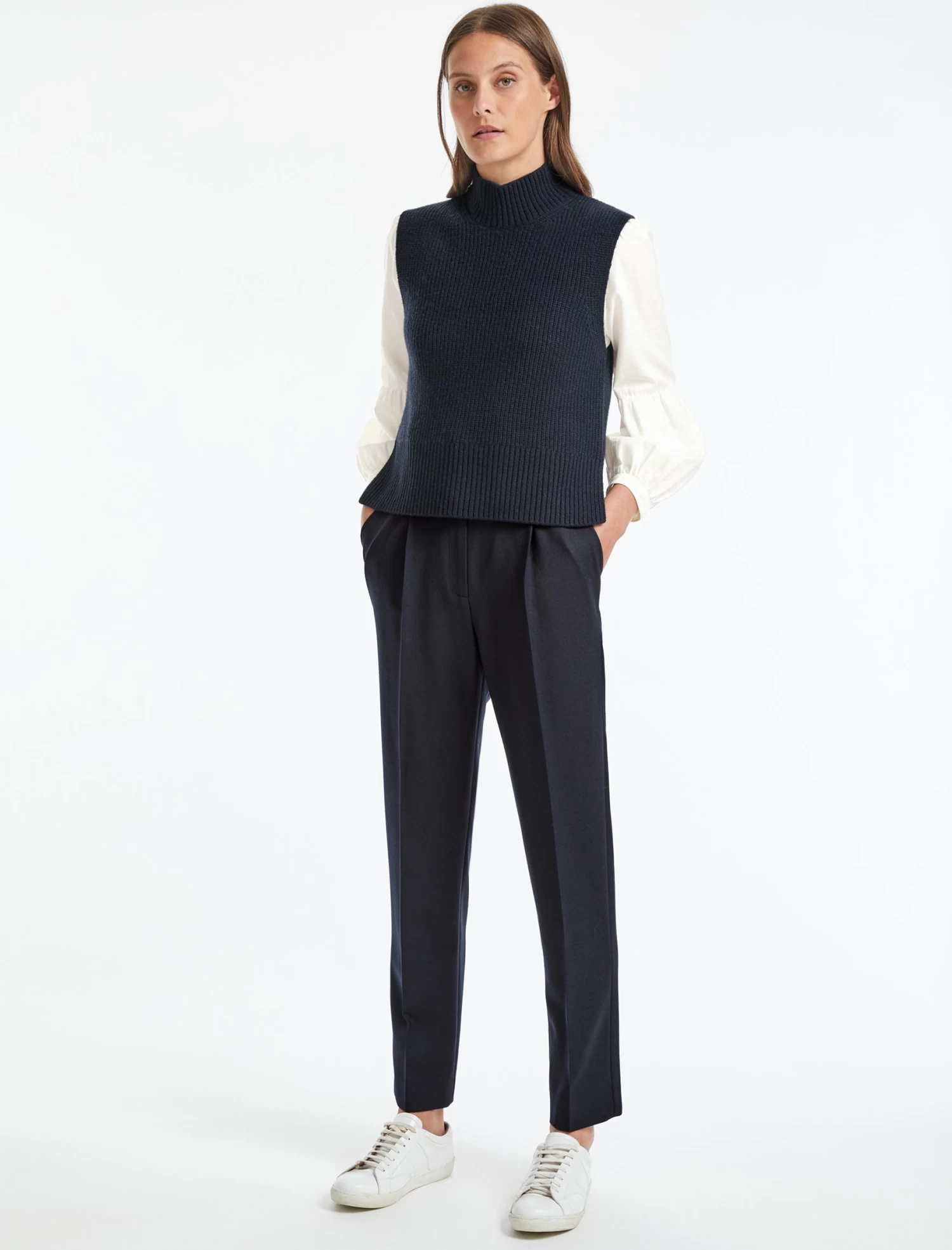 Pieces that neatly combine comfort, versatility and style are essential this winter. Our sleeveless Janie jumper is just the ticket. A brilliant layering piece, the fully fashioned armholes ensure it sits snugly over any sleeve – whether a tailored shirt or blouson blouse – while the dropped hem and side slits mean it effortlessly slips over voluminous dresses or skirts, as well as a tee and jean or shirt and tailored trouser. Hello, Little Miss Versatile!