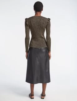 Our metallic Jessie top is designed in our stretchy, ribbed Lurex knit with a sparkly yarn and pretty shoulder frill detailing. Ideal for elevating wardrobe staples in the day, it also has evening get-togethers covered with our Tiana skirt or tailored Tyson trouser and a heel.