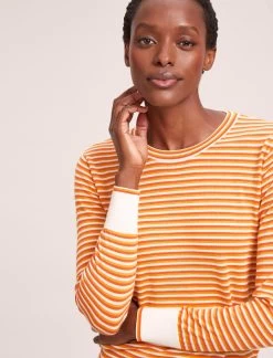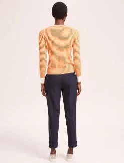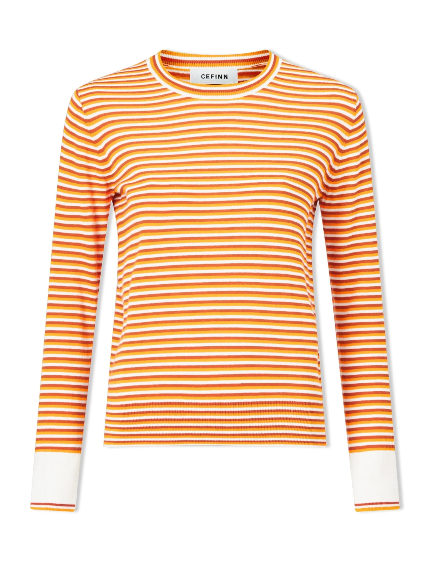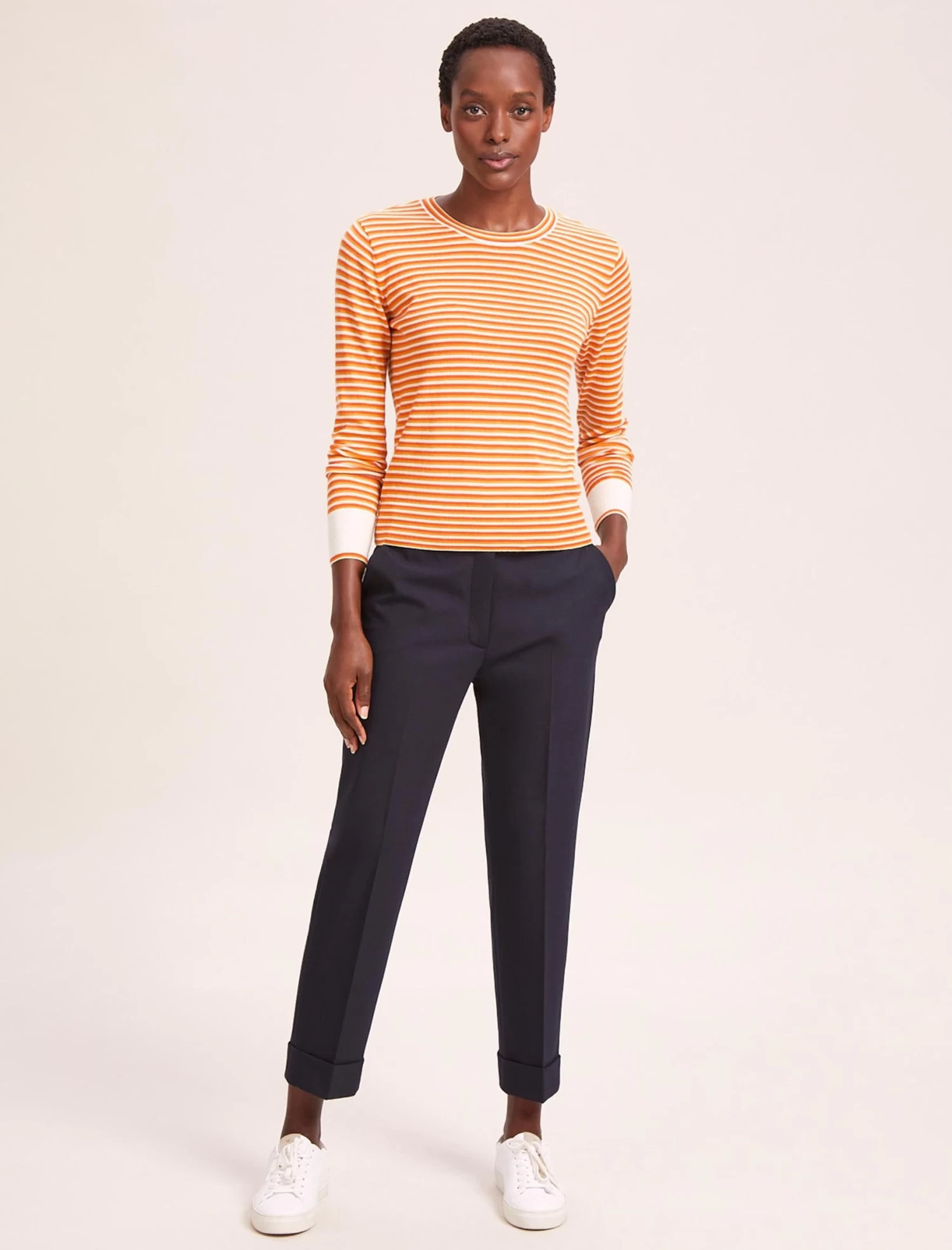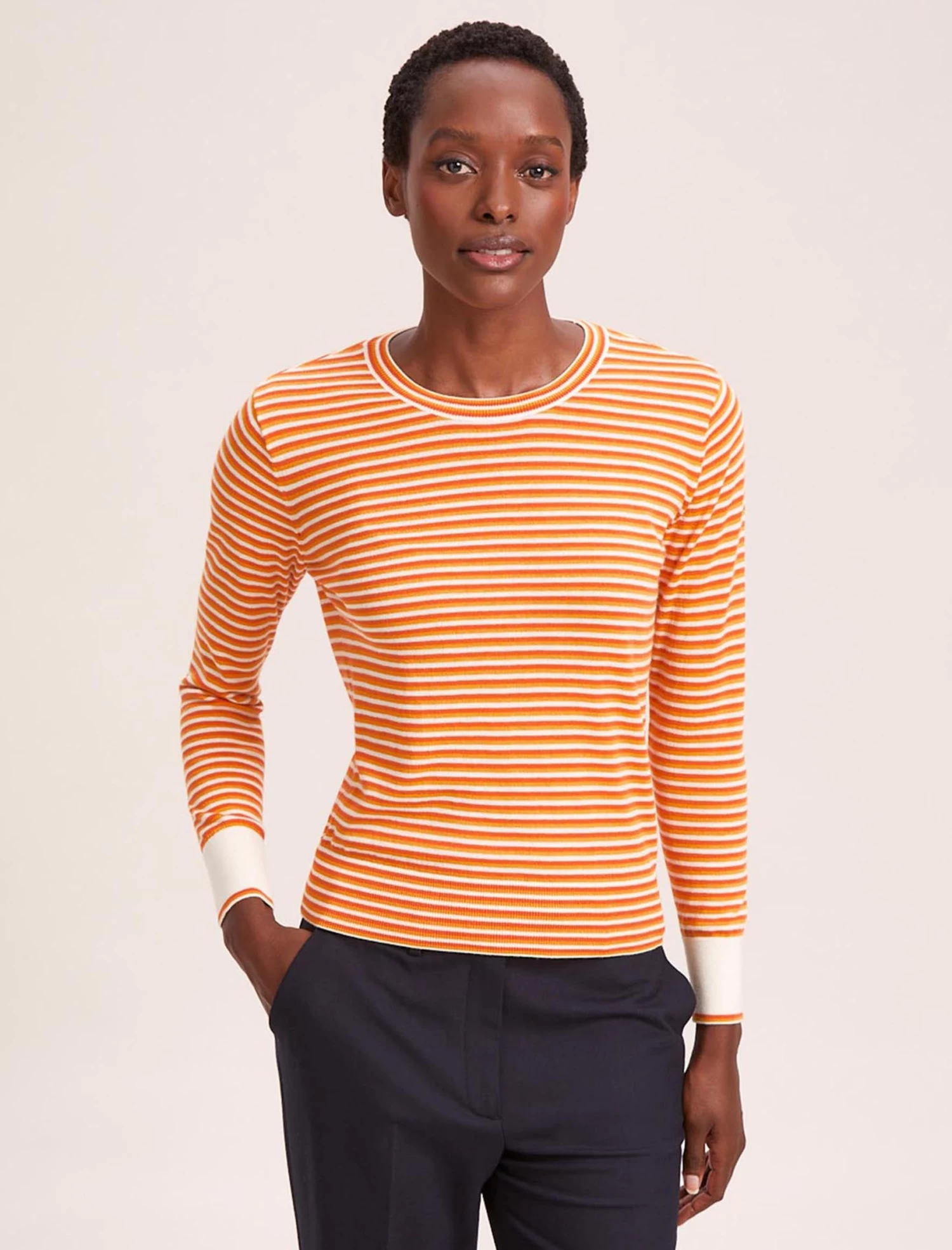 Lightweight knits are a British summer must-have and our best-selling Jodi is an elevated take on a classic crew neck. Knitted in a soft cotton-merino blend stripe with contrast cuff, it’s timelessly chic and endlessly versatile. Wear it casually with denim or dress it up with a tailored trouser, under a blazer or with a leather skirt – this season’s Teal and Orange versions pair perfectly with the Tiana and Sierra.