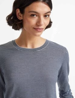 Let’s face it, you can never have enough lightweight summer knits – especially with the unpredictable British summer! Jodi is designed in a navy blue fine-gauge, cool merino wool woven with an on-trend stripe. Timelessly chic, it pairs well with our neutral Techni-Linen collection (Hayden or Tate wide-legged trouser or Lyla skirt) but is endlessly versatile. Wear it on relaxed summer days whether in the city or country or throw it on over a swimming costume and denim cut-offs on the beach.