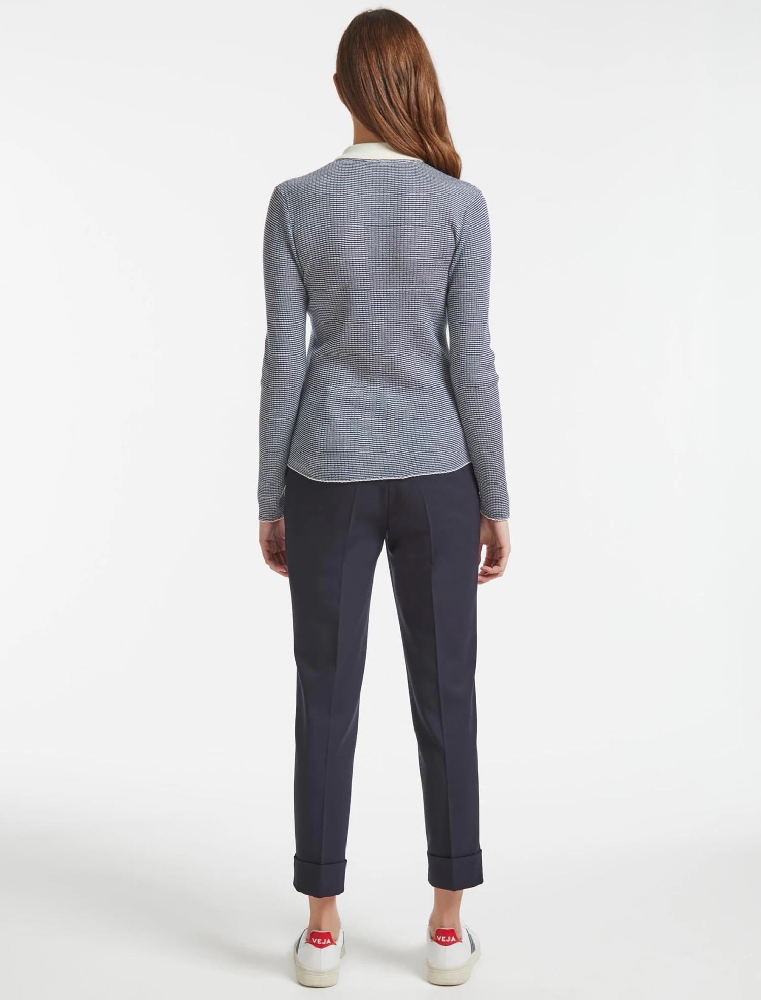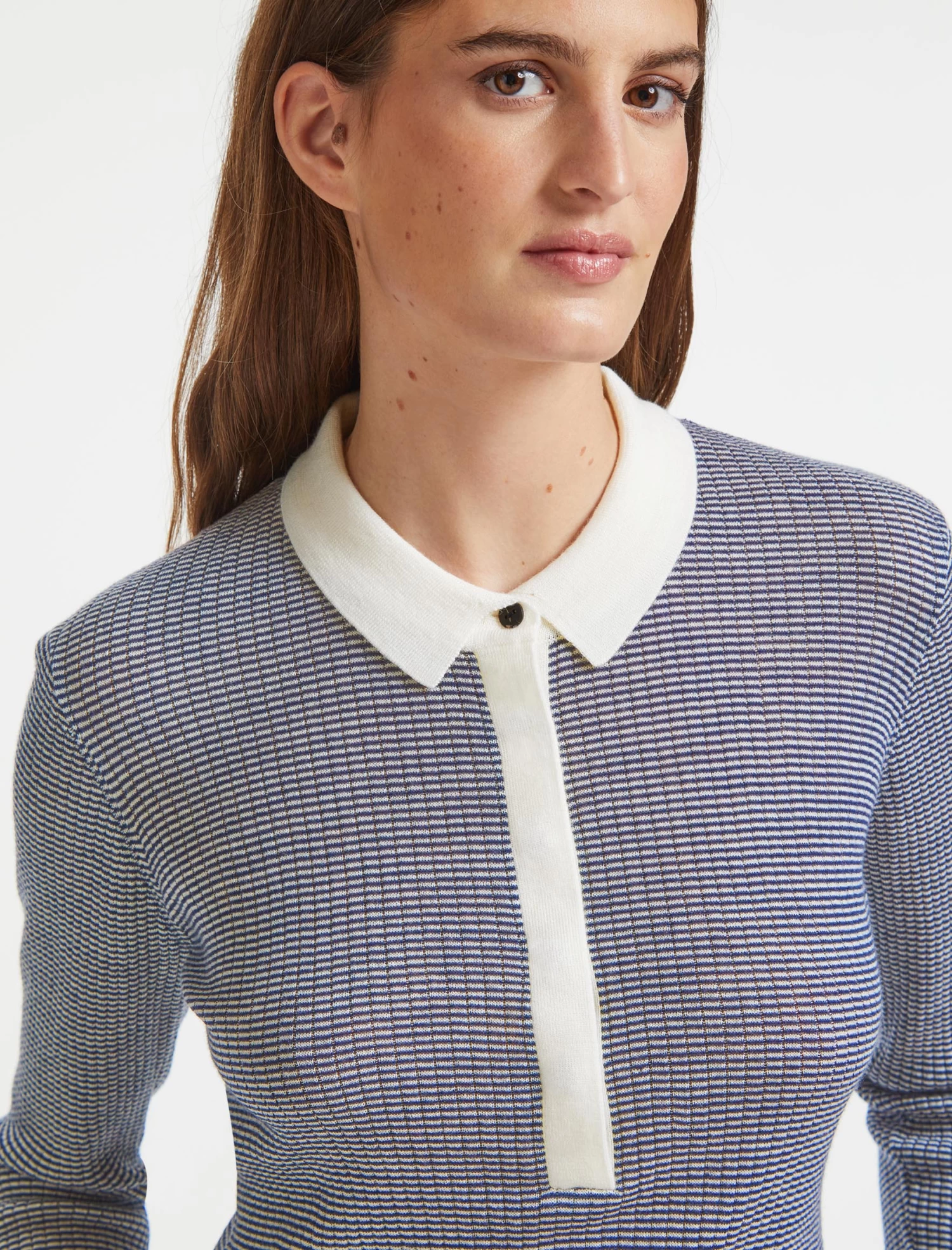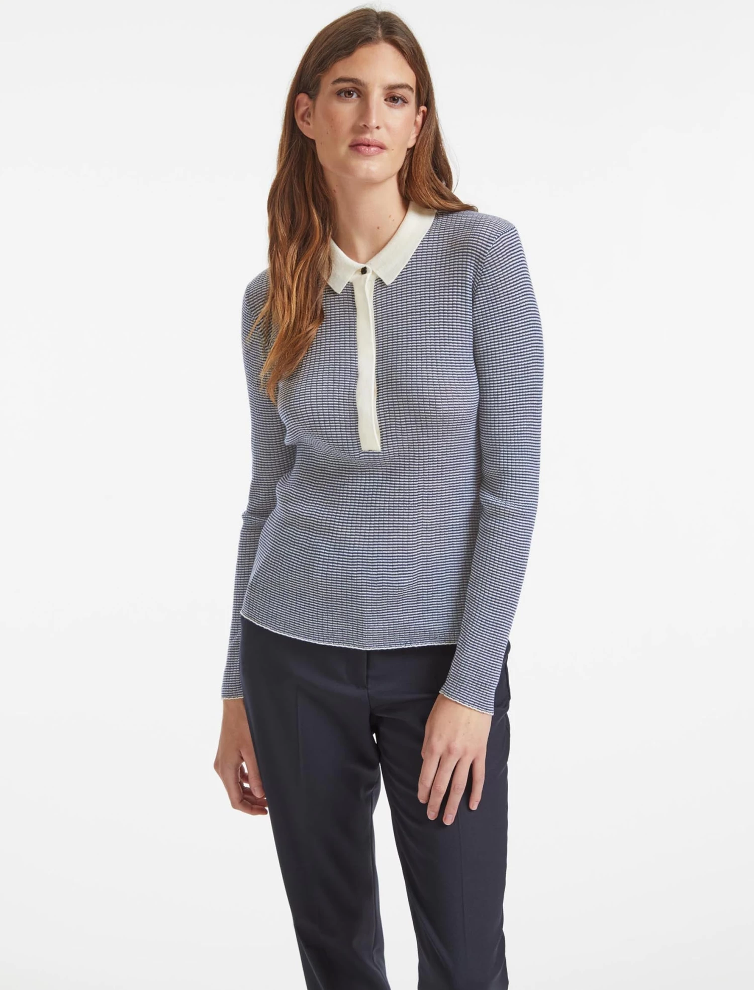 The Jonah takes it’s cues from a classic polo top, but in a light-weight merino rib knit. Perfect for layering under a jacket or tucking into high waisted skirts and trousers, the micro stripe and contrasting collar give it a fresh, modern spin.