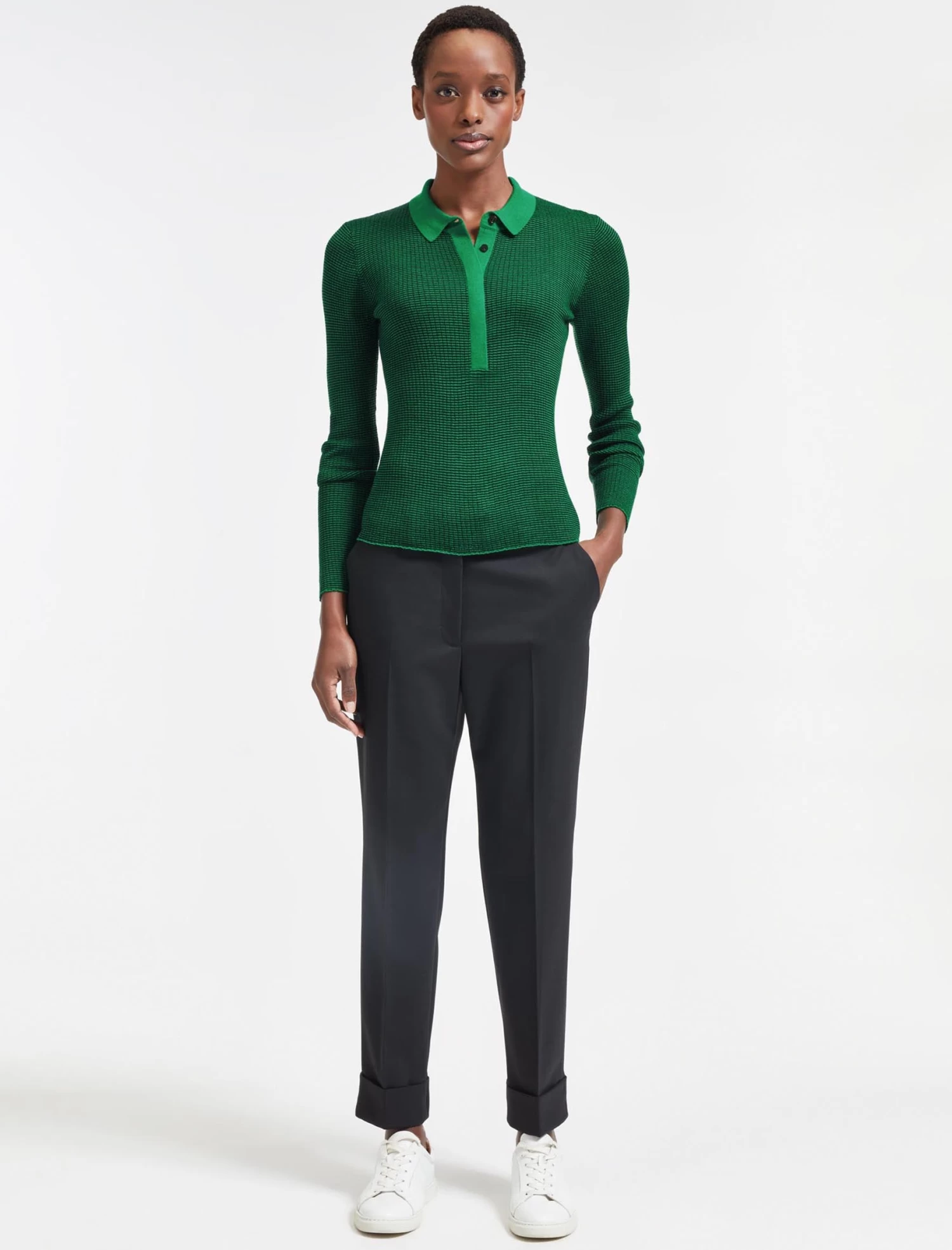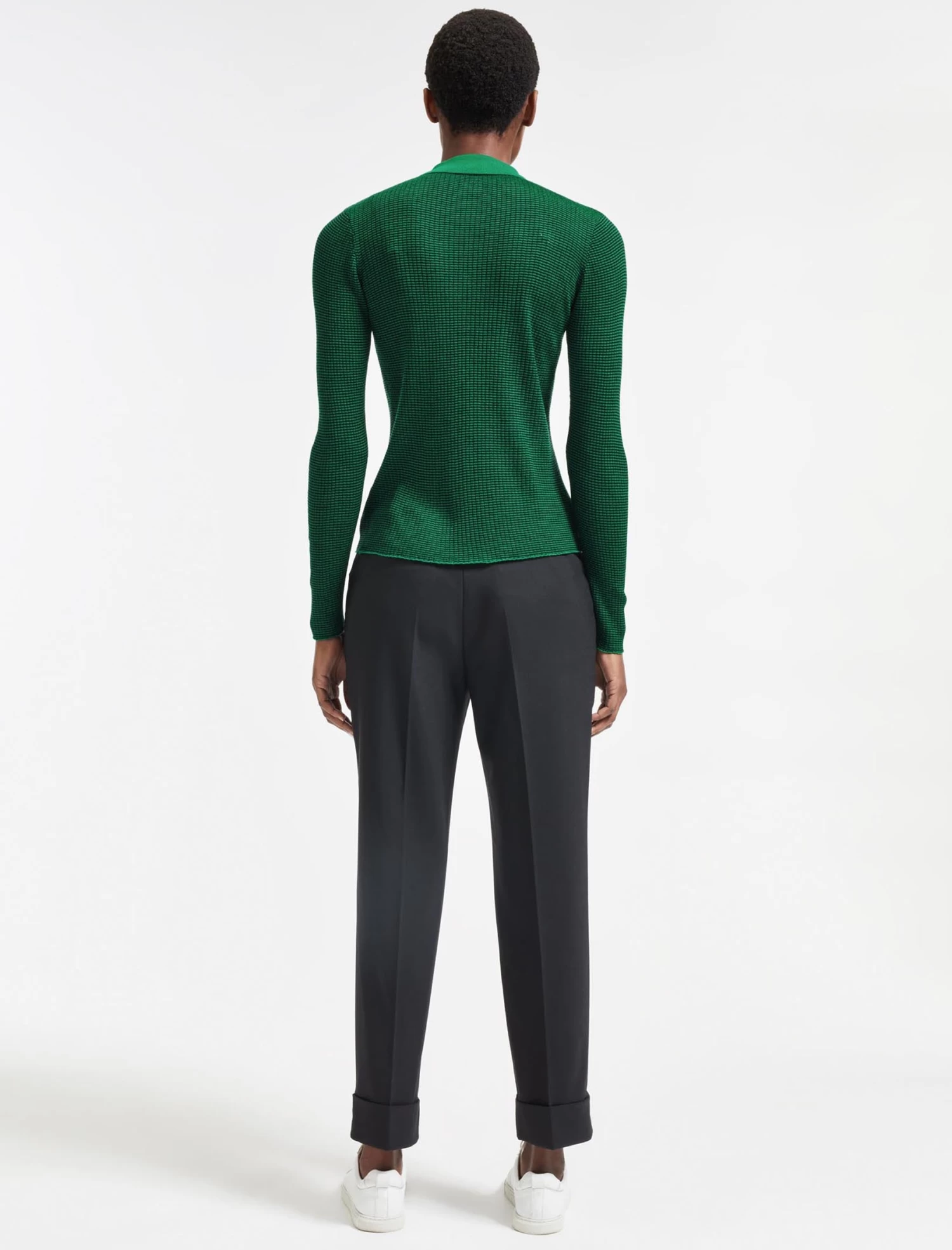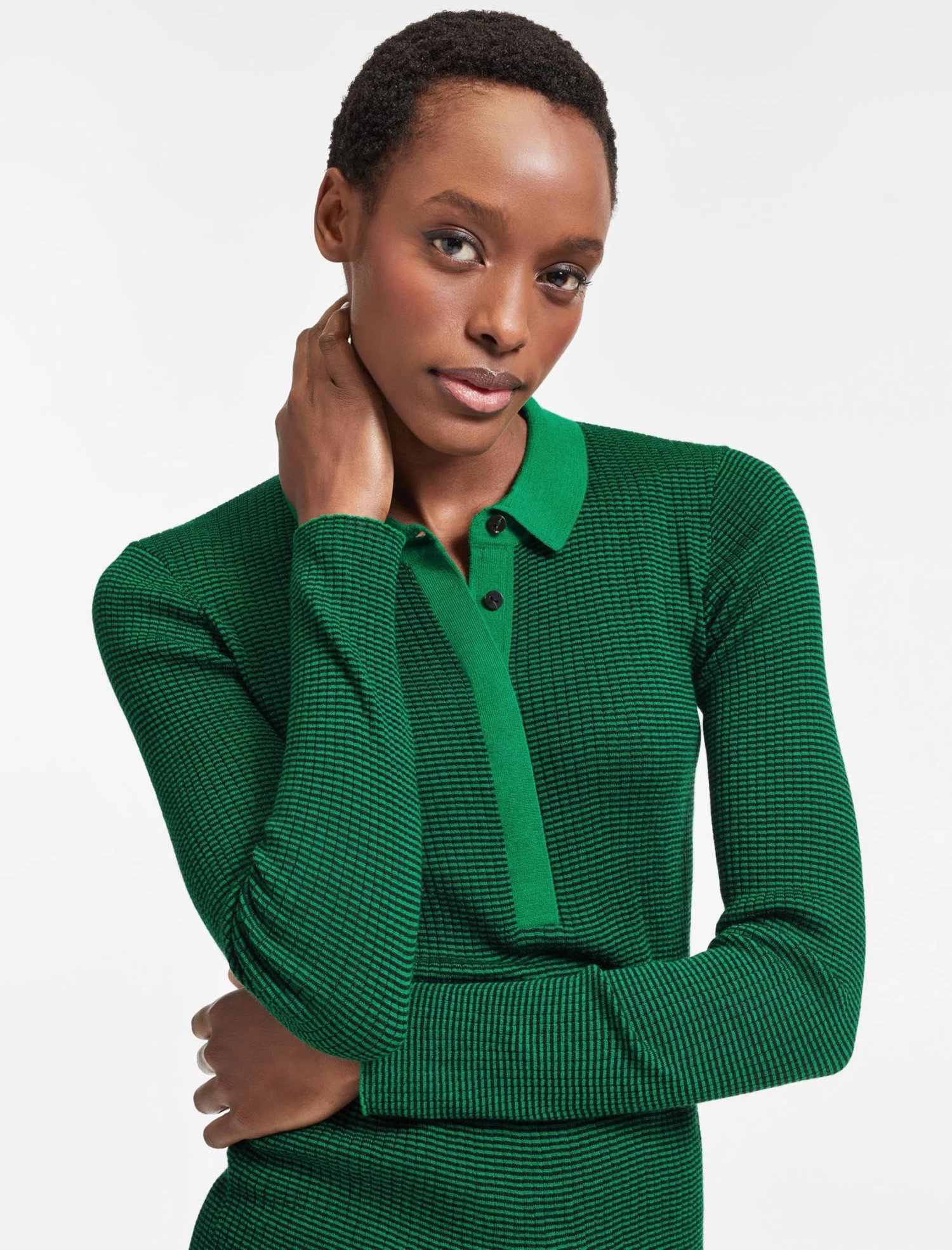 The Jonah takes it’s cues from a classic polo top, but in a light-weight merino rib knit. Perfect for layering under a jacket or tucking into high waisted skirts and trousers, the micro stripe and contrasting collar give it a fresh, modern spin.