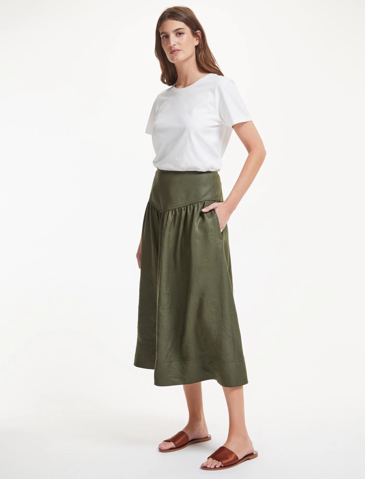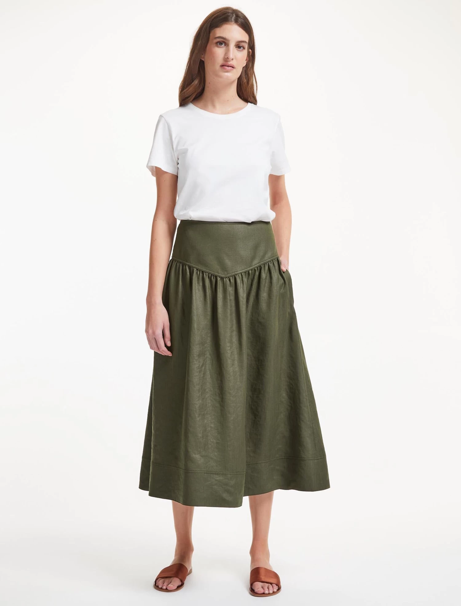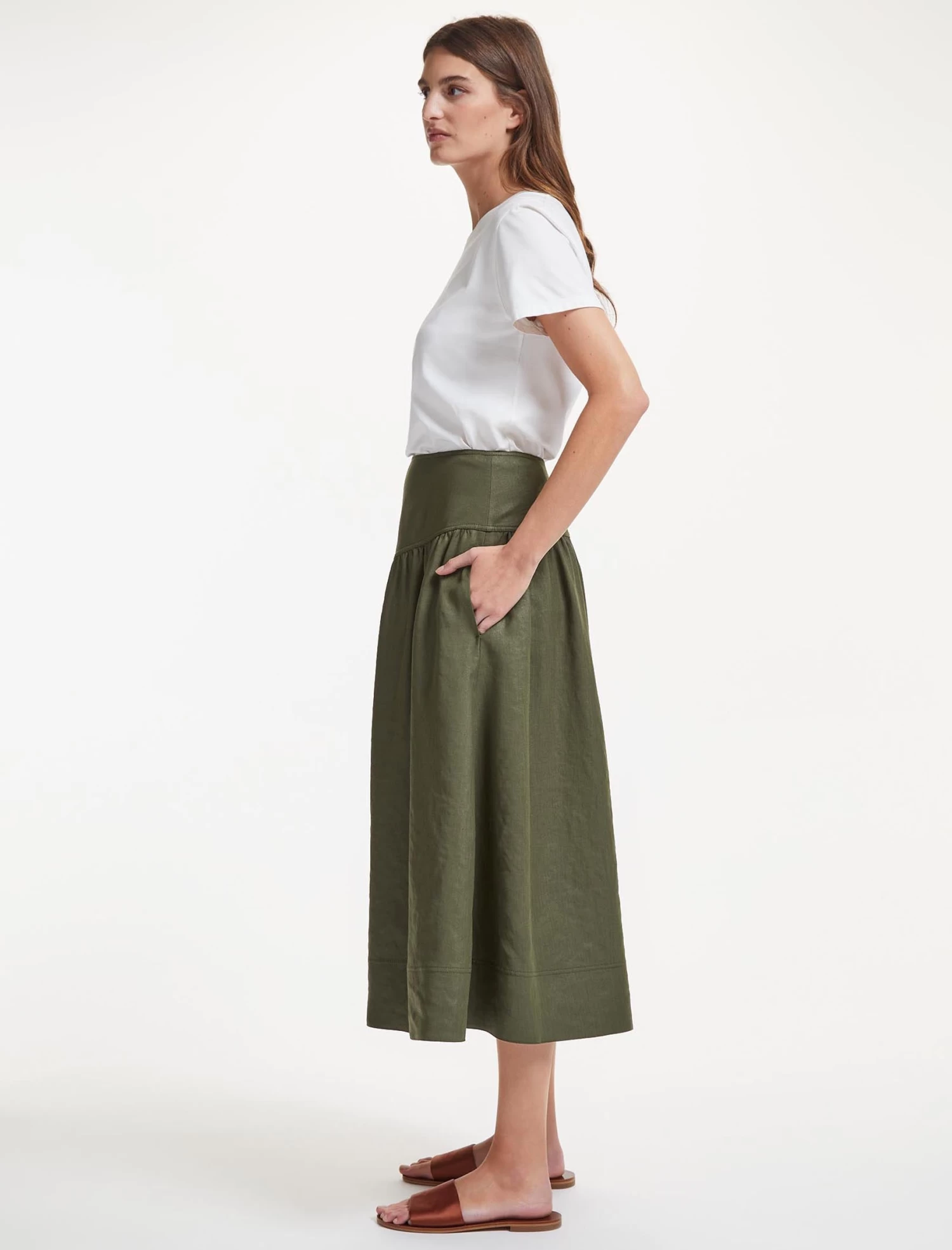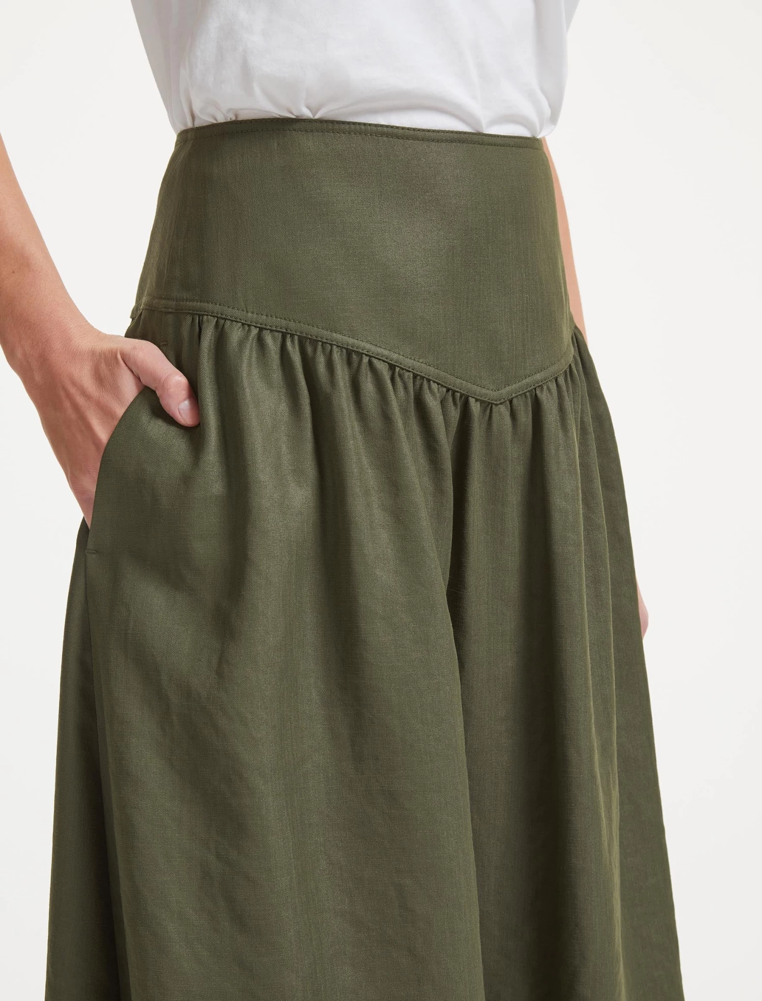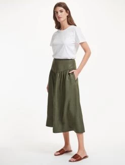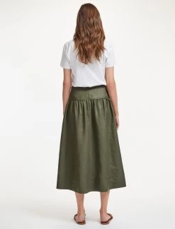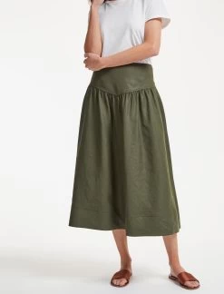 The ultimate spring/summer wardrobe go-to, our khaki green Lyla skirt is cut from a Techni-Linen with utility-style twin-needle stitching, a flattering gathered drop waist and discreet side pockets. Combining the crisp feel of a linen with the practicality of a washable fabric, it’s perfect for relaxed days whether at home or abroad. Wear with a simple tee or one of our spring knits – Caro, Jimmy, Meryl or Jodi.