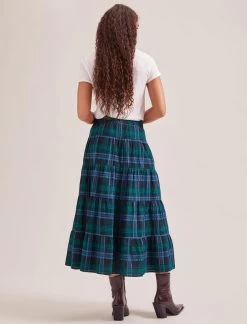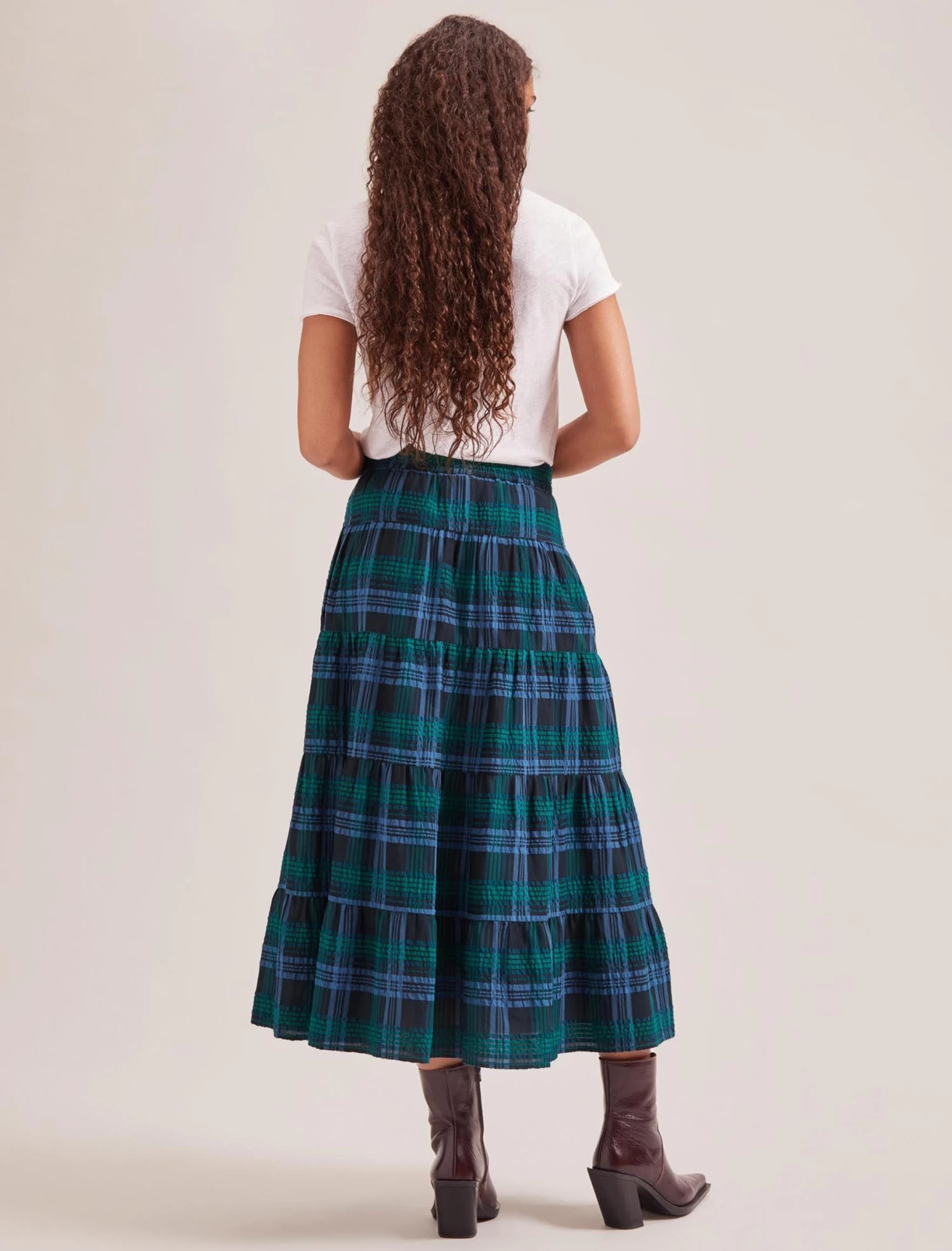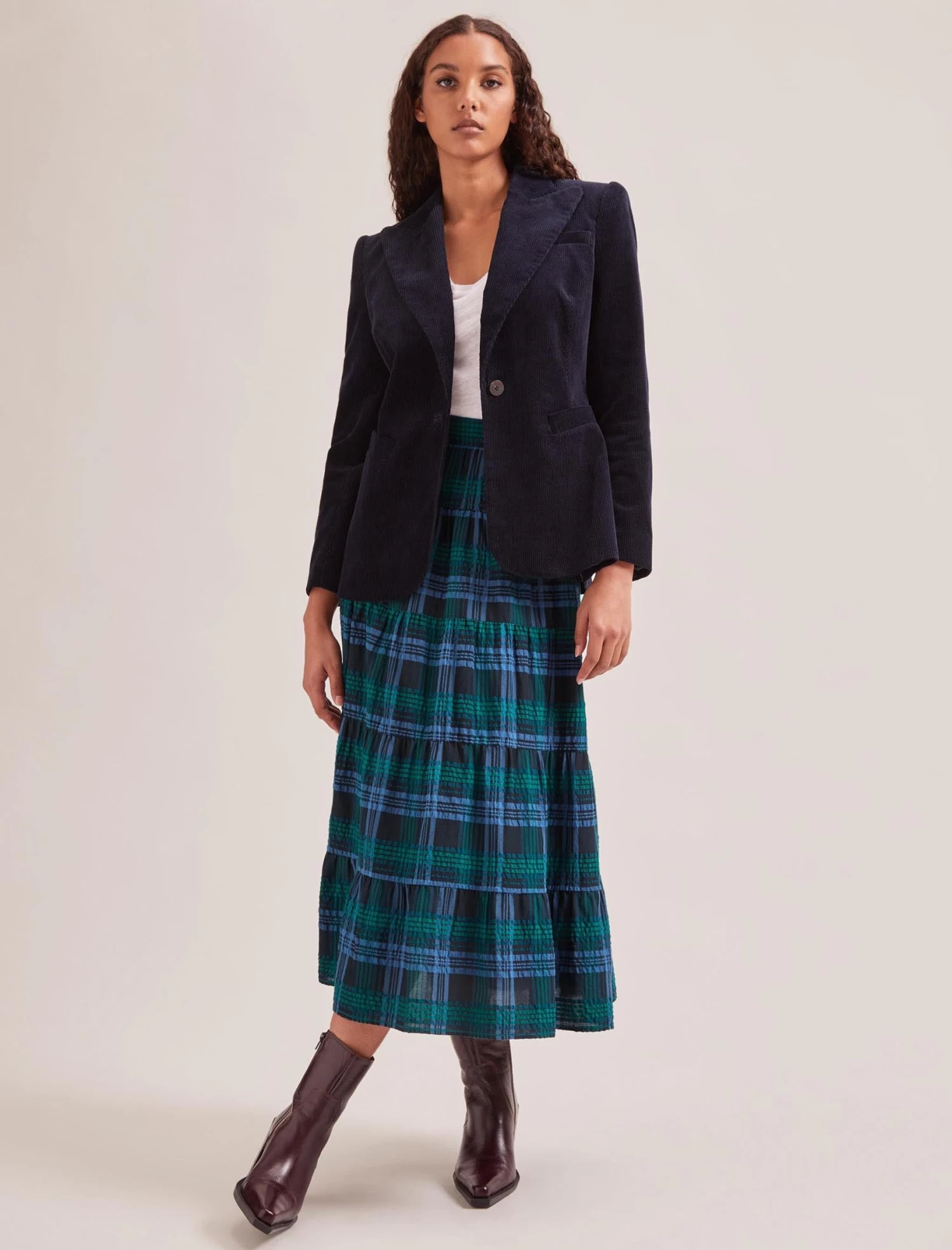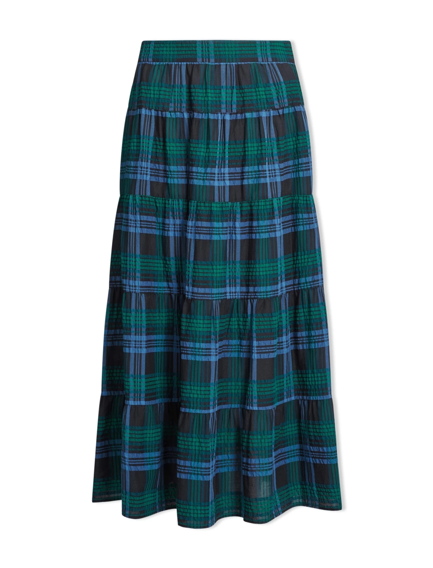 Nothing says relaxed ease quite like a seersucker skirt. Ideal for day-to-day wear, the elasticated waist, handy side pockets and tiered skirt ensure it’s both functional and fashionable. The smart check print in navy and green pairs well with our Janice knit and Wesley waistcoat.