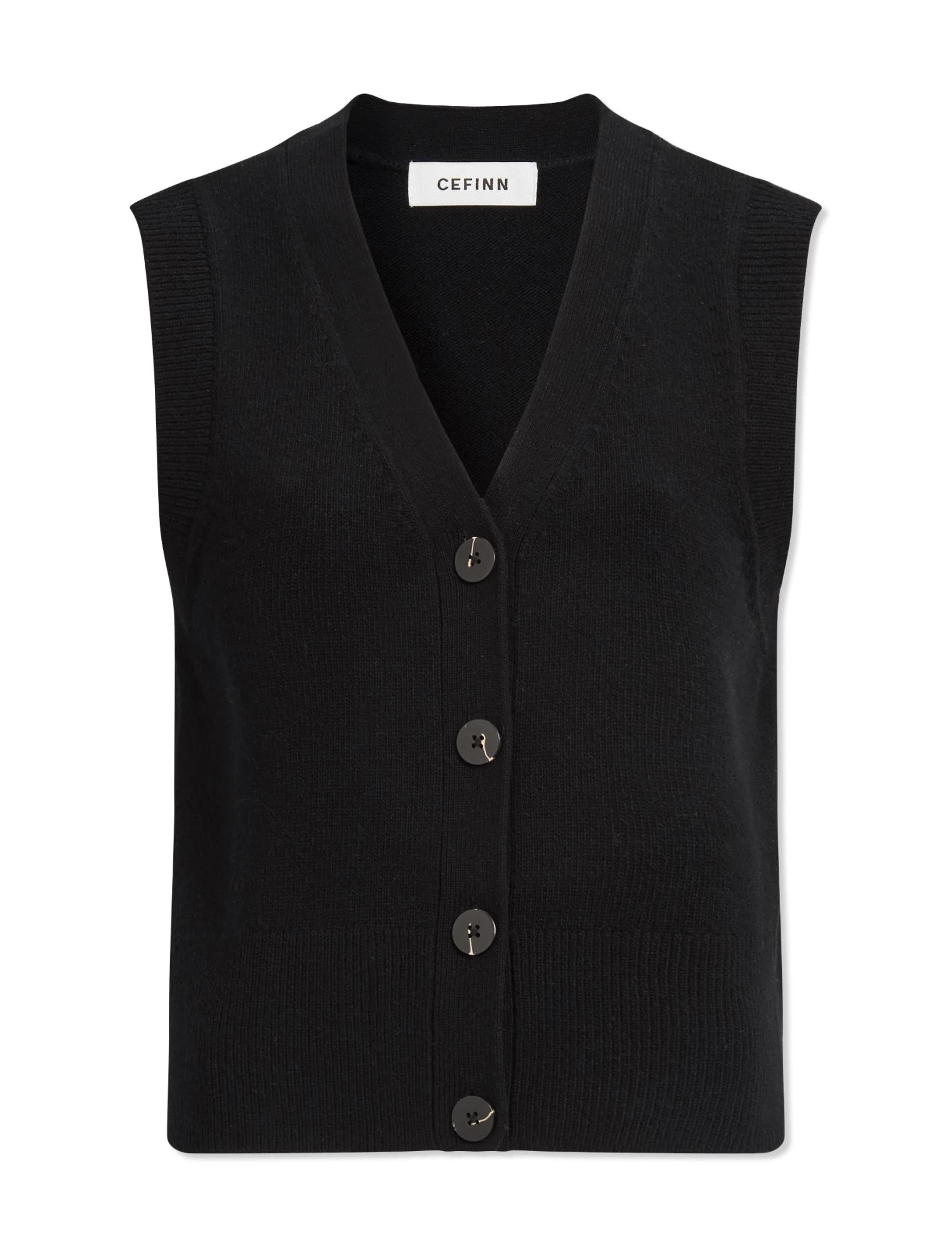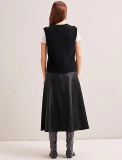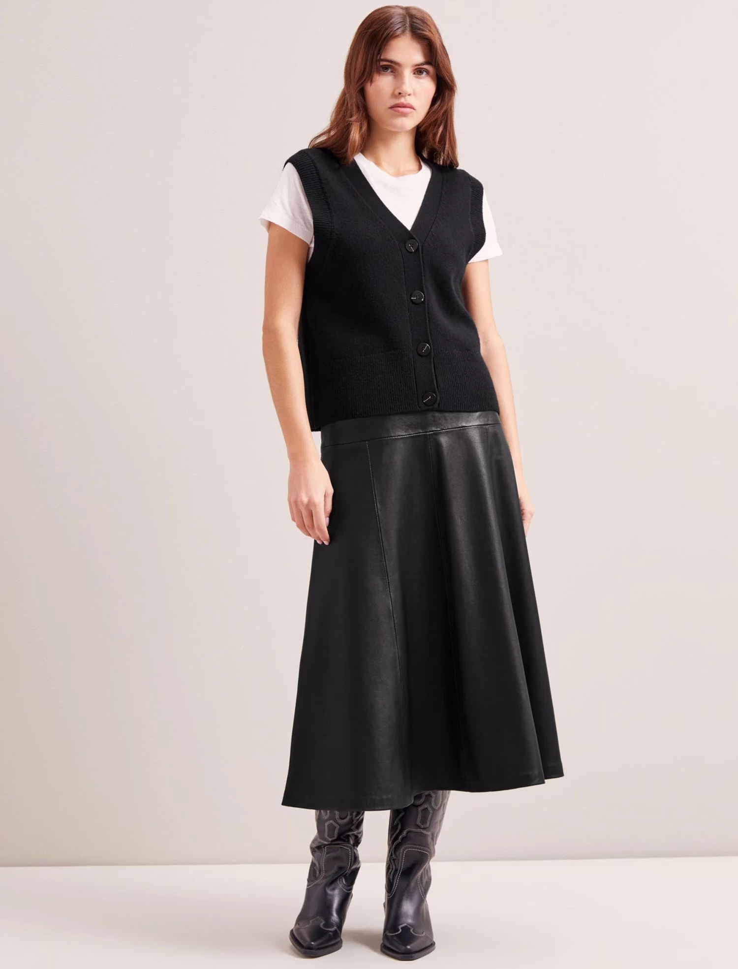 The perfect year-round layering staple, we’ve designed Meryl in a classic black wool blend. Whether worn under a blazer or alone (summaryed or undone for a more androgynous look), the flattering knitted waistcoat silhouette and fitted armholes fit snugly over dresses or long-sleeved tops. Complement the on-trend knit with our classic leather Tiana skirt and a silk shirt.
