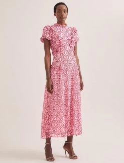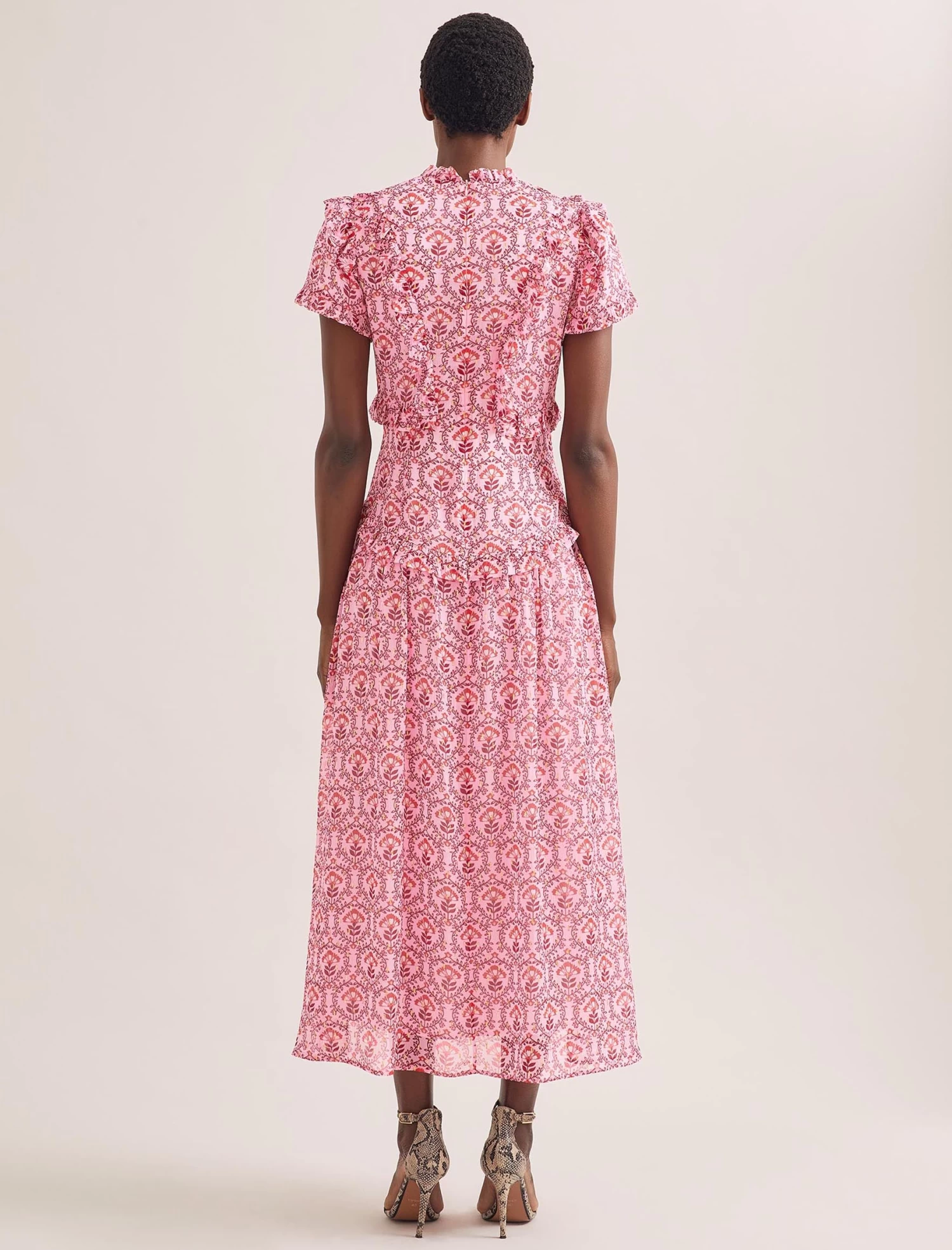 Designed in delicate georgette with shimmering gold metallic fil coupé detailing, Mirabel is the ultimate summer event dress. Fully lined yet light and airy, the contouring cut and frill placement is incredibly flattering making this the dress for a stand-out statement.