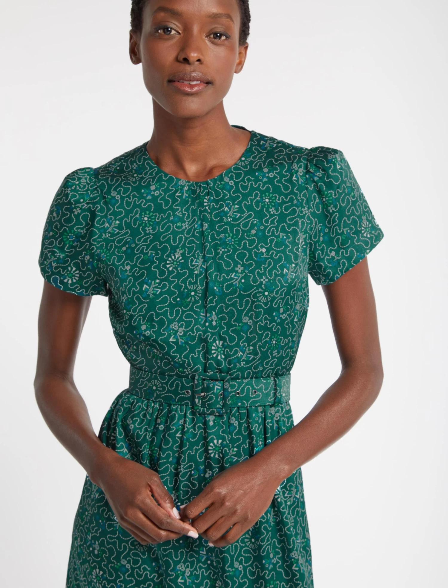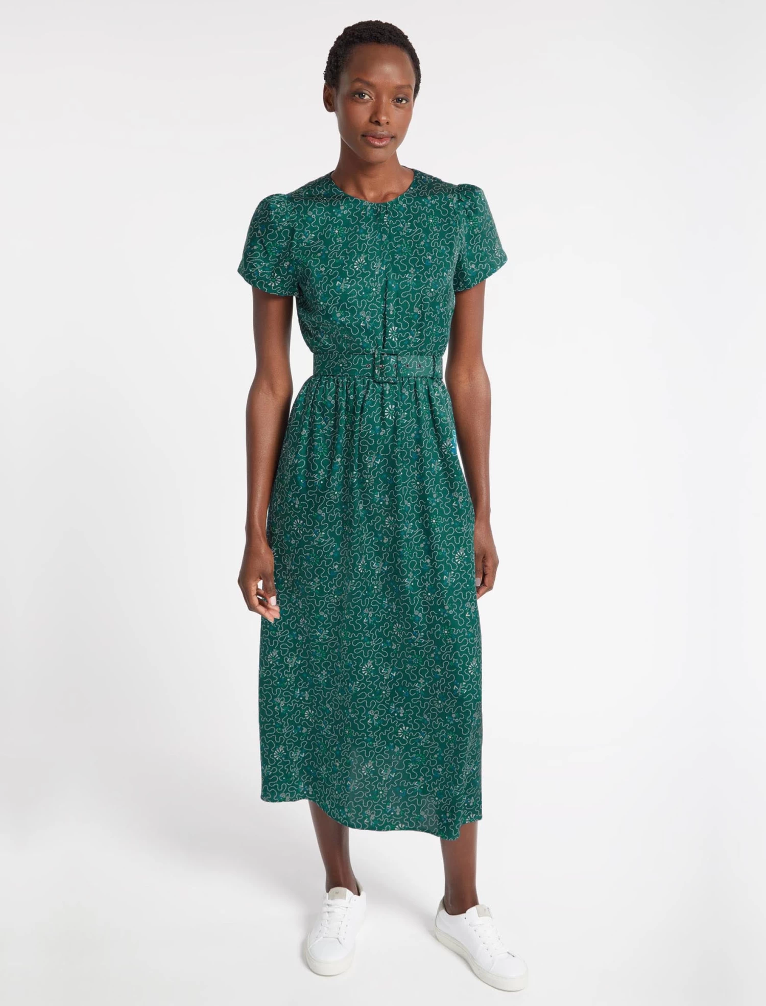 New for Winter 22, Nina has day-to-night, all-year-round appeal. Designed in our recycled poly twill that is silky to the touch and patterned with our striking wiggle print, you’ll feel pulled-together, poised and polished – even on time-pressed days. The matching detachable belt elevates it for evening, while the easy silhouette means it works just as well for day with our Kelis cardigan and a long boot.