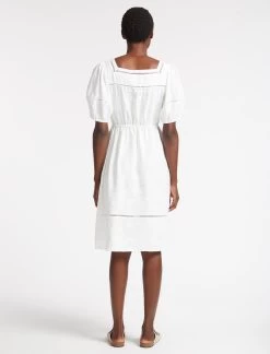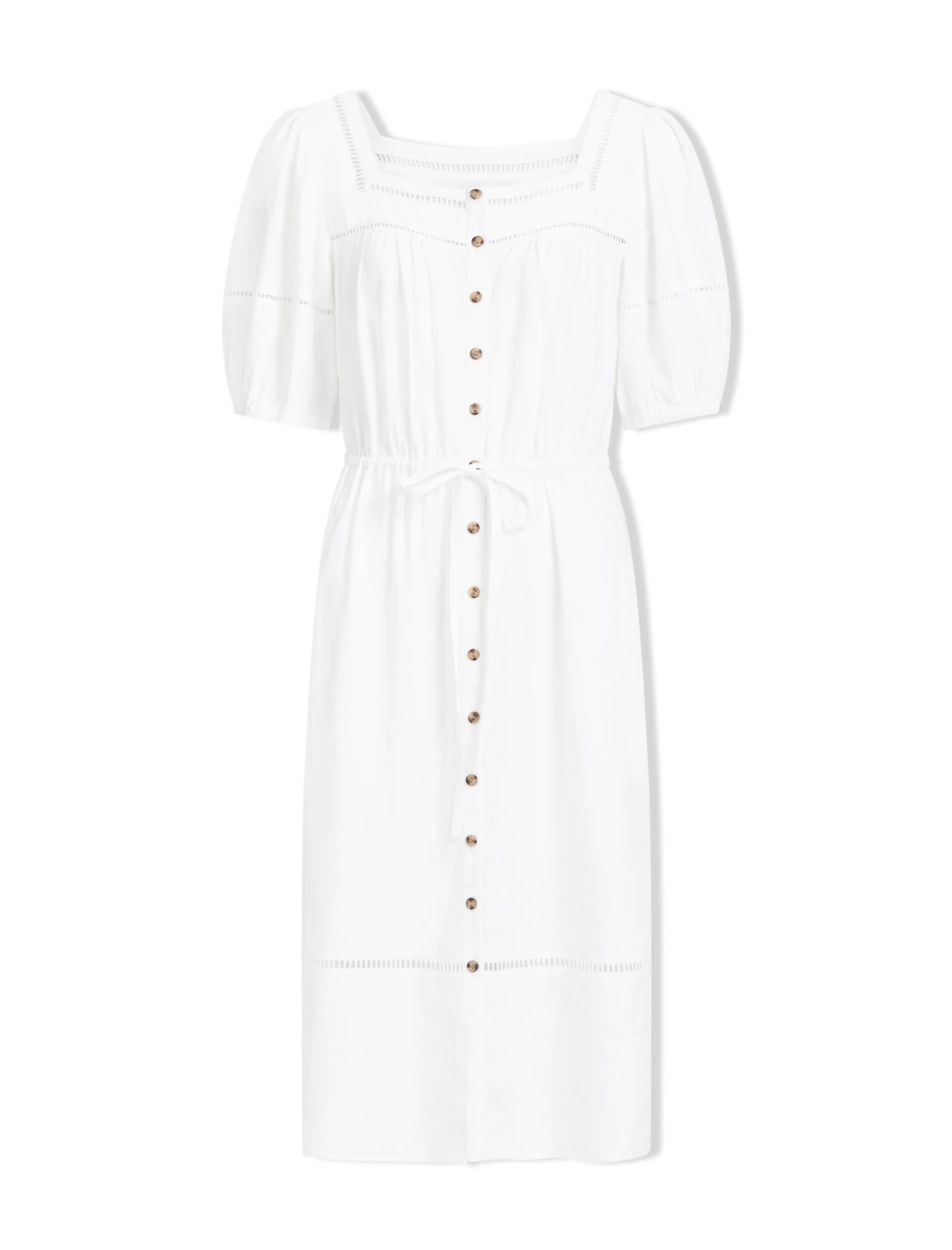 Reminiscent of 1950s British summertime, our Poppy dress is made for sun-drenched days. Designed in our brand-new, machine-washable linen blend in our emerald and white colourways, it will keep you feeling cool and collected. The elasticated puff sleeves, ladder trims, square neckline and summary-through placket (undo at the hem for a flirty, carefree twist) add to its nostalgic sensibility.