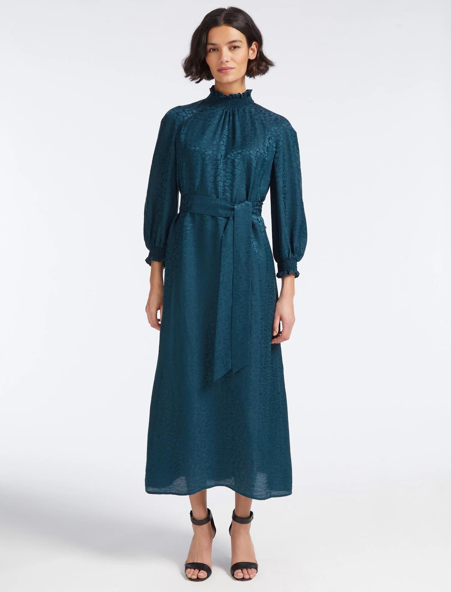 A rework of one of our bestselling silhouettes, Rosamund is a unique column shape. Sophisticated and wearable in equal measure, it is cut from our signature silk blend jacquard and has easy raglan sleeves and a relaxed waistline, which can be cinched with a detachable sash. A deceptively versatile style – simply add a black pointy heel or boot.