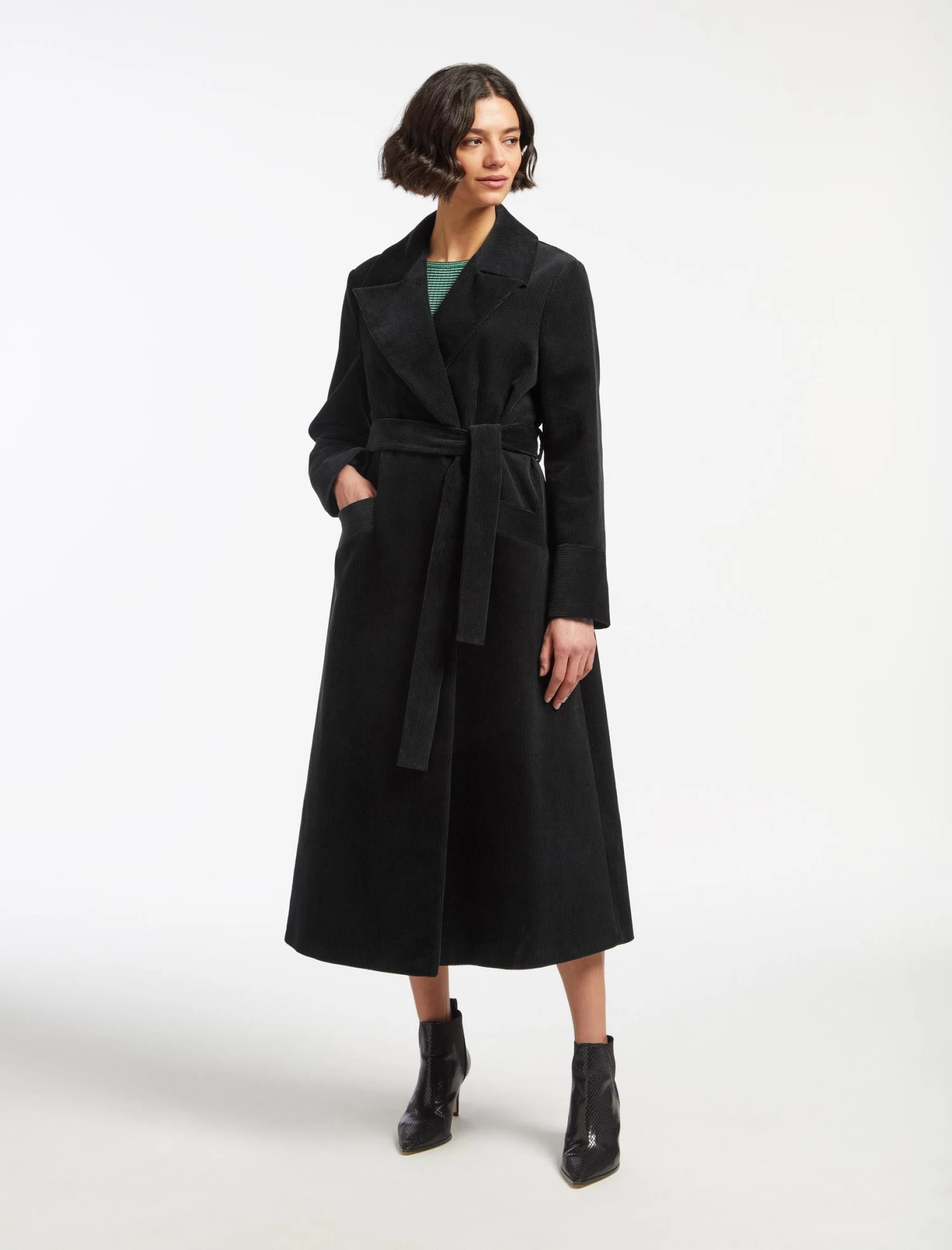 Introducing our latest Roxanne coat, perfectly tailored for the season. Crafted from a jumbo corduroy in a convenient wrap style, it features spacious pockets and a waist-defining belt. With its full-length silhouette, you can elevate your look with sleek winter boots or embrace a more relaxed vibe with causal footwear.