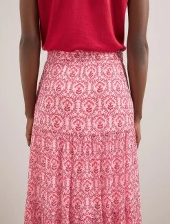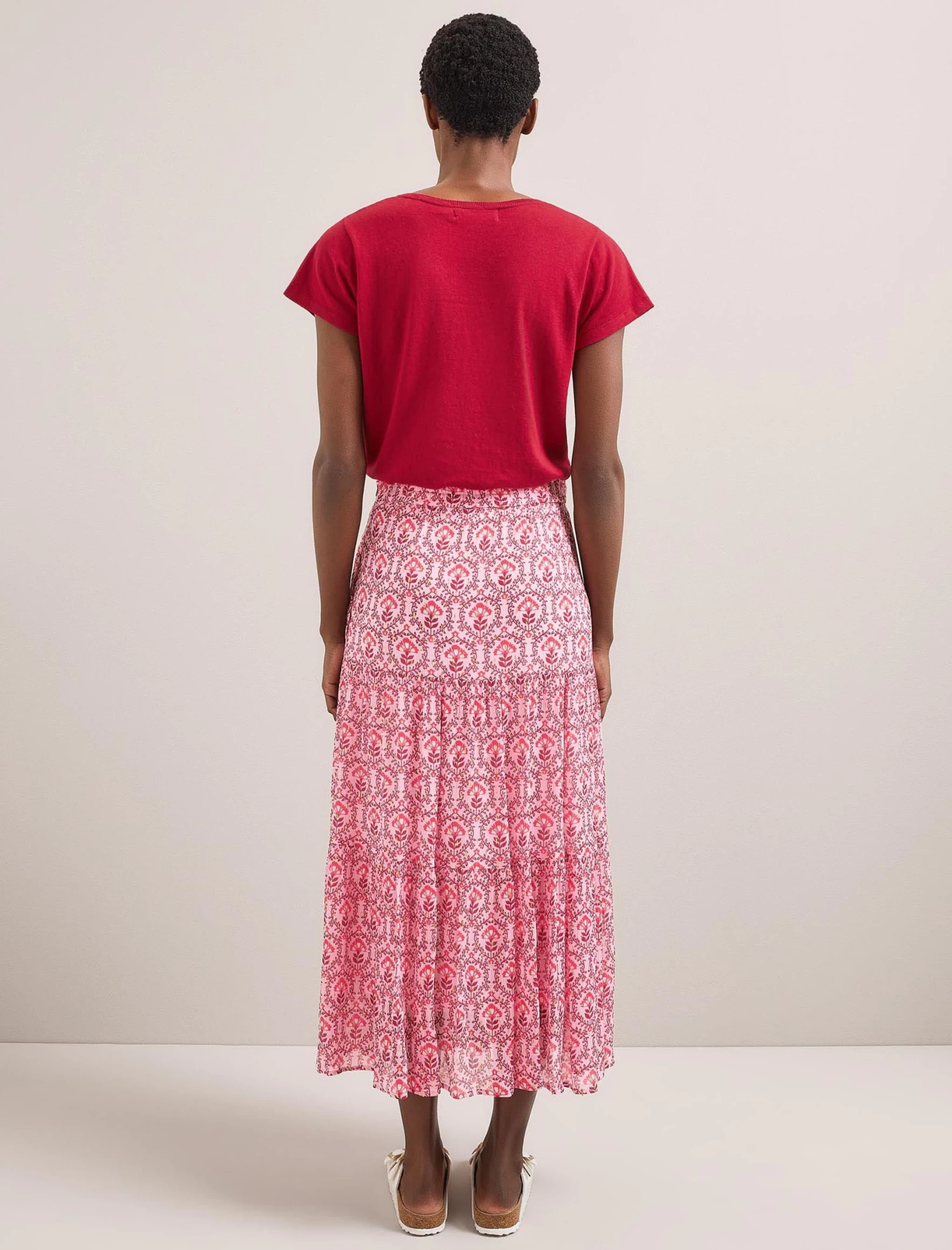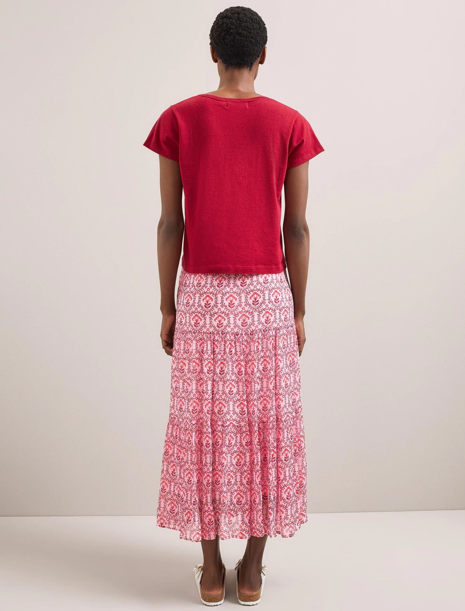 Cut from lightly crinkled georgette with gathered tiers and featuring a romantic floral print with glimmering gold metallic fil coupé, the Sedra skirt exudes femininity. Special enough for a dressed-up occasion, it can also be worn more casually with a t-shirt or sleeveless knit, earning it summer staple status.