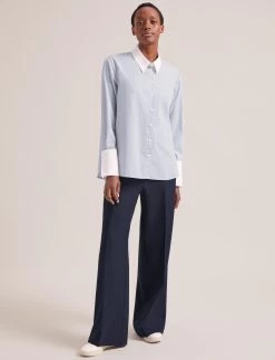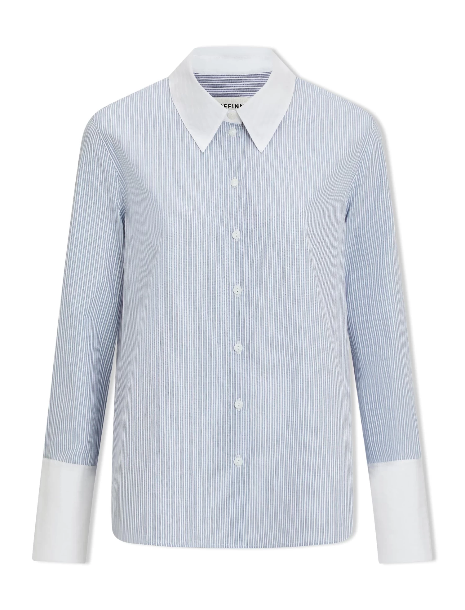 Who doesn’t love a striped mannish shirt? Shaking off any corporate connotations, our new organic cotton shirting has a luxe feel and crisp handle. Seymour’s jacquard stripe, contrasting collar and oversize turn-up cuffs add a contemporary twist to the classic shirt. Wear done-up with denim or wide-leg trouser, or partially undone with a vest and tailoring.