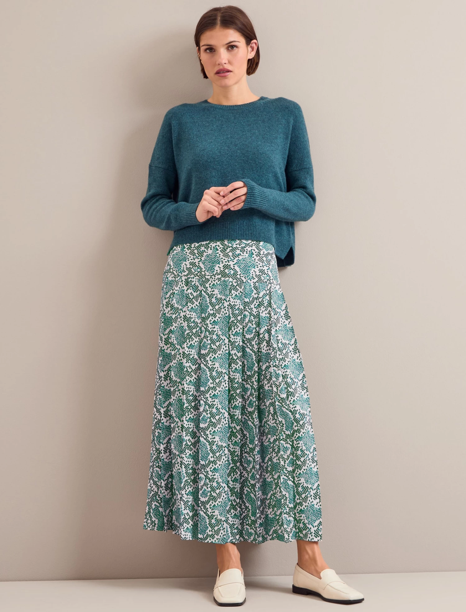 Our much-loved Sienna skirt is back in a recycled hammered crepe with a contemporary snakeskin print that partners perfectly with our cashmere knits, silk blend tees and more. Permanently pleated and machine washable, it’s as easy to look after as it is to style. Wear with a boxy Lainey jumper paired with a loafer, boot or trainer and you are good to go.