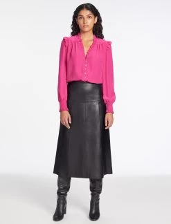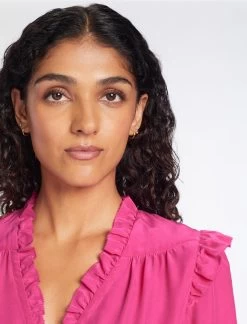 A repeat of our bestselling blouse, Stella is effortlessly sexy and always ready to step up to the party plate. Designed in 100% silk, the feminine style has a V-neckline with ruffle detailing, delicate rouleaux summarys and gathered detailing along the yoke and shirred cuffs. Endlessly versatile, Stella pairs perfectly with a leather skirt, smart trouser and suiting alike.