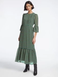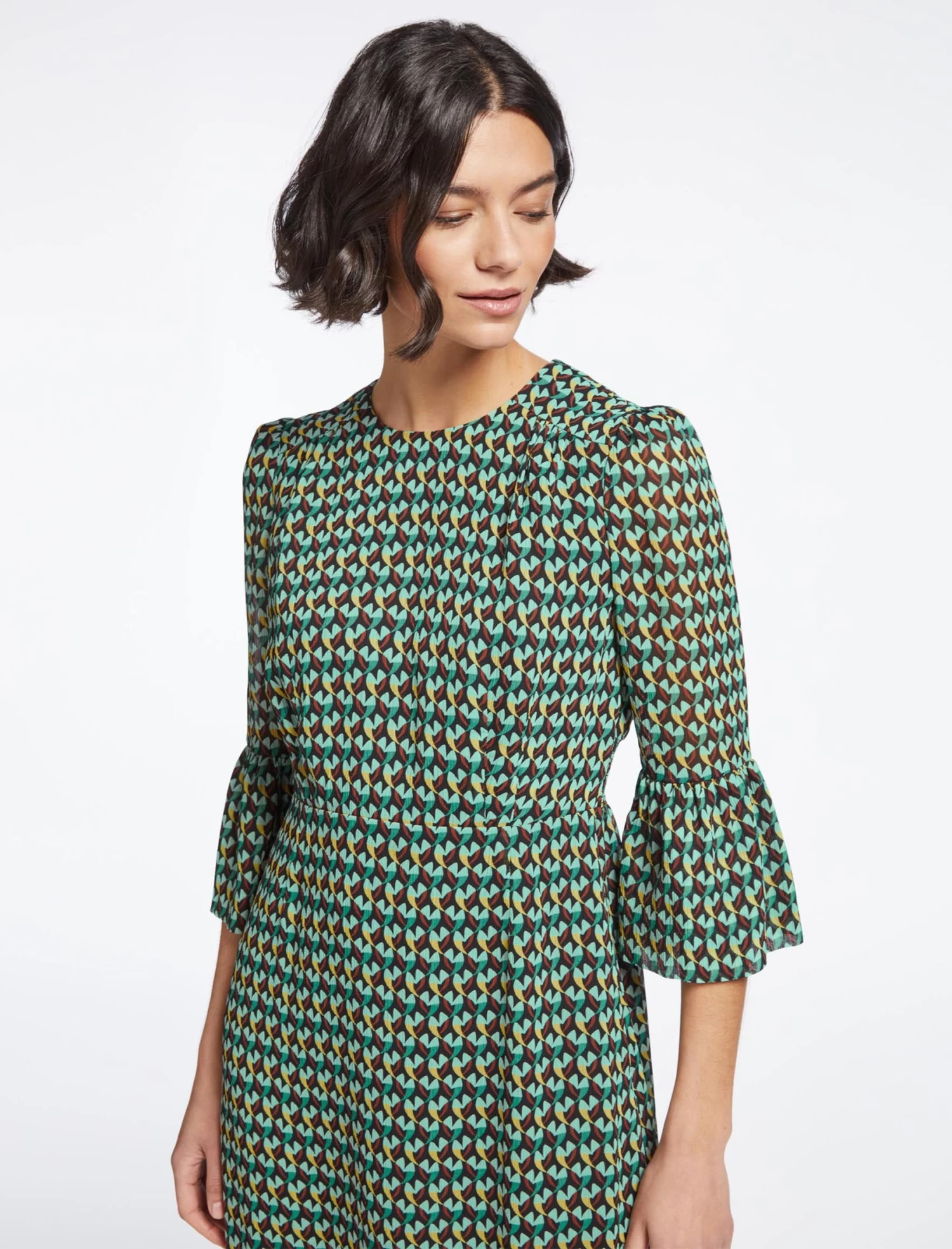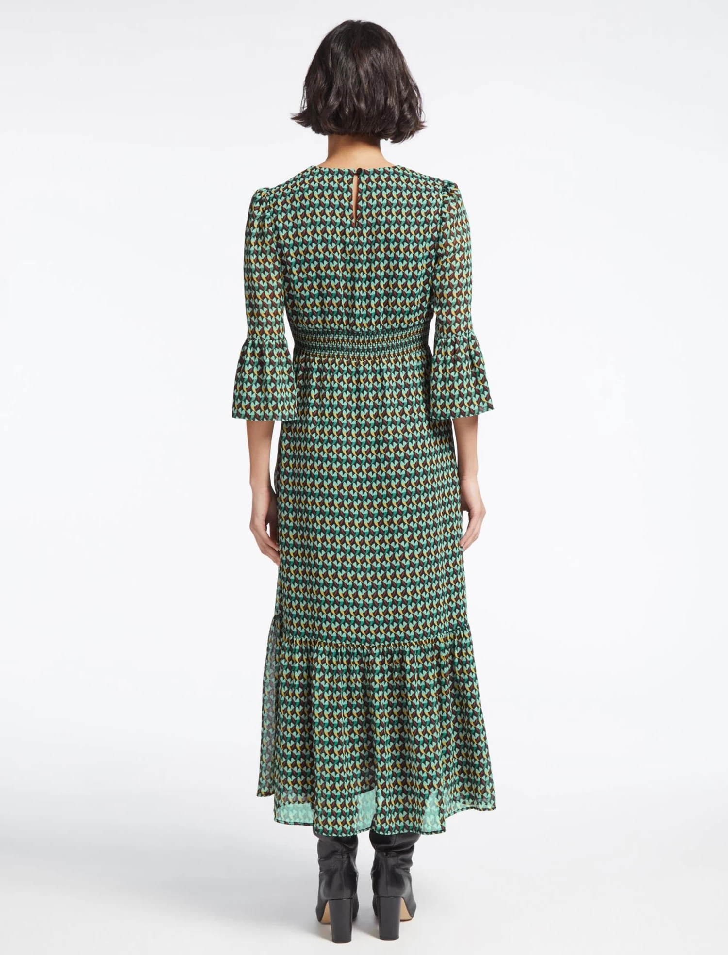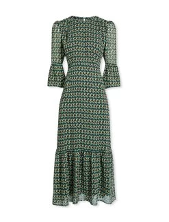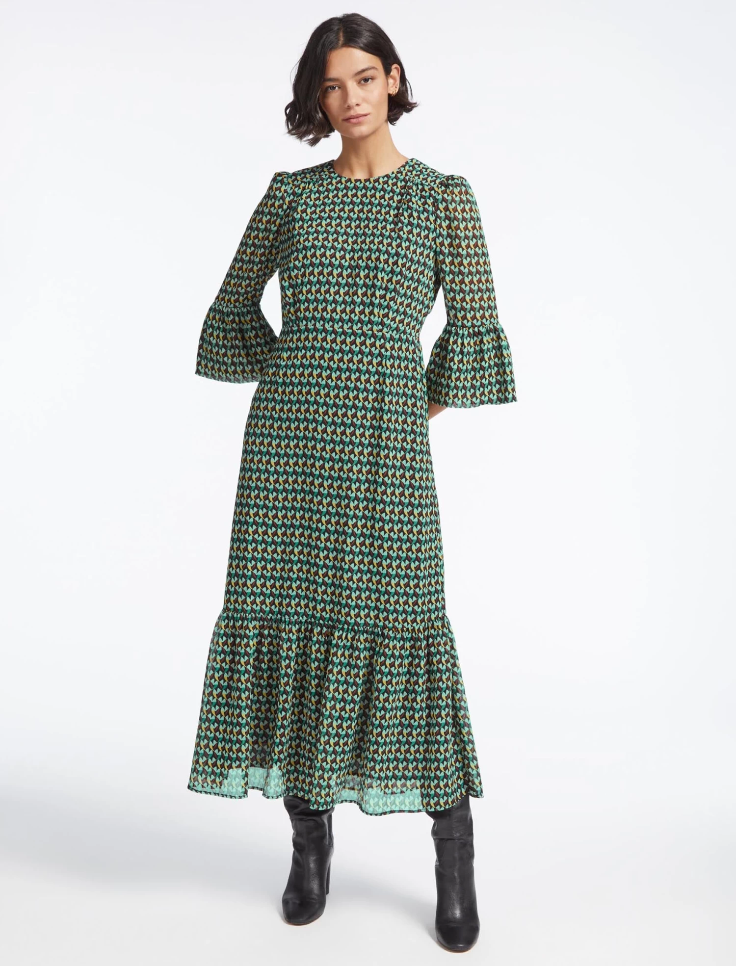 Play to the season’s luxuriously low-key mood with Tibi. Designed in our machine-washable recycled georgette with our spring-fresh geo or classic polka-dot print, it has an easy fit through the waistline (including an elasticated waist on the reverse) and a softly tiered hem. The fluttery three-quarter-length, double-turned sleeve and gathered shoulder ensure it covers office days and lunches with elegant ease.