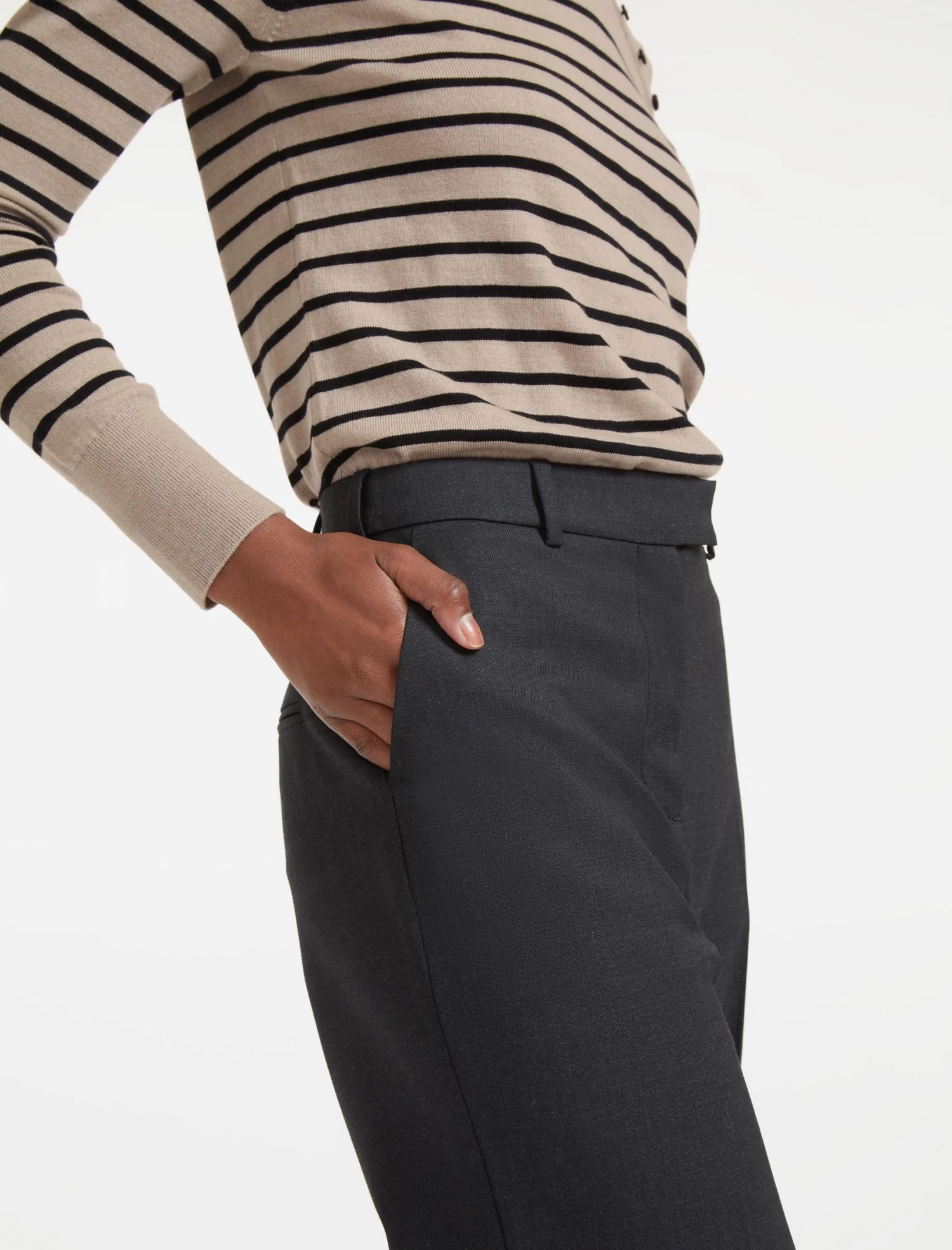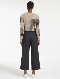 Our Turner trouser has been designed in wool-blend stretch suiting, making it a year-round staple. The wide-leg, cropped cut, turn-up cuff detail and elasticated back waist ensure everyday wearability and styling versatility. You’ll feel instantly pulled together, no matter where the day takes you and no matter your footwear – a slender heel or calf-length boot work equally as well.