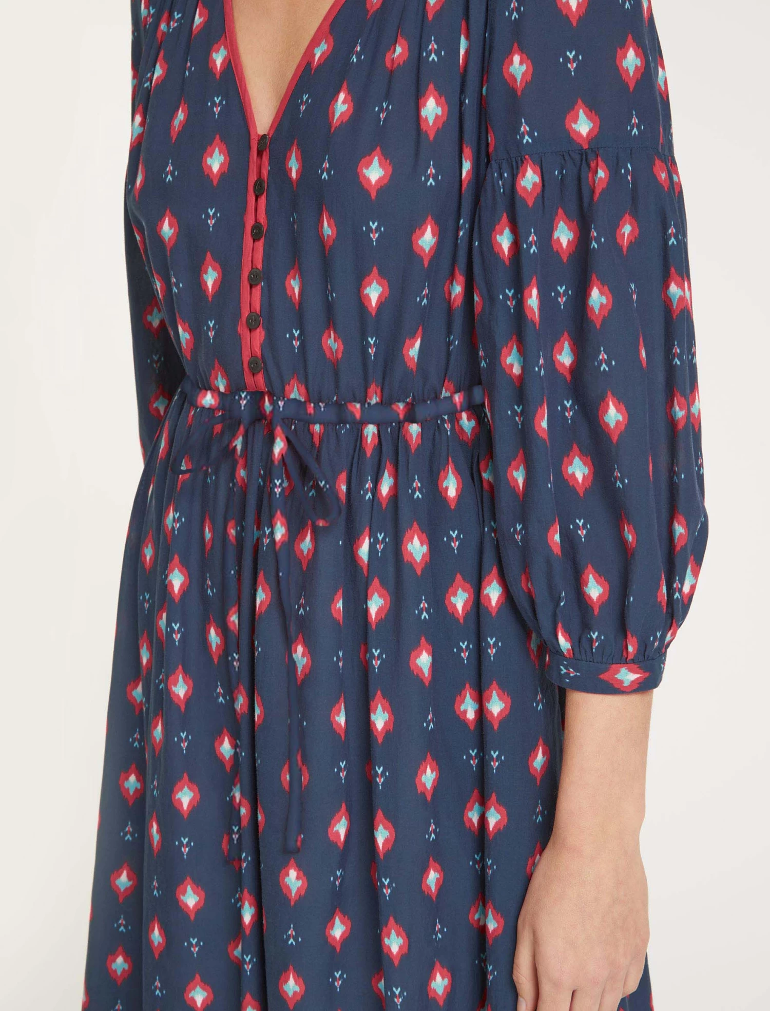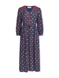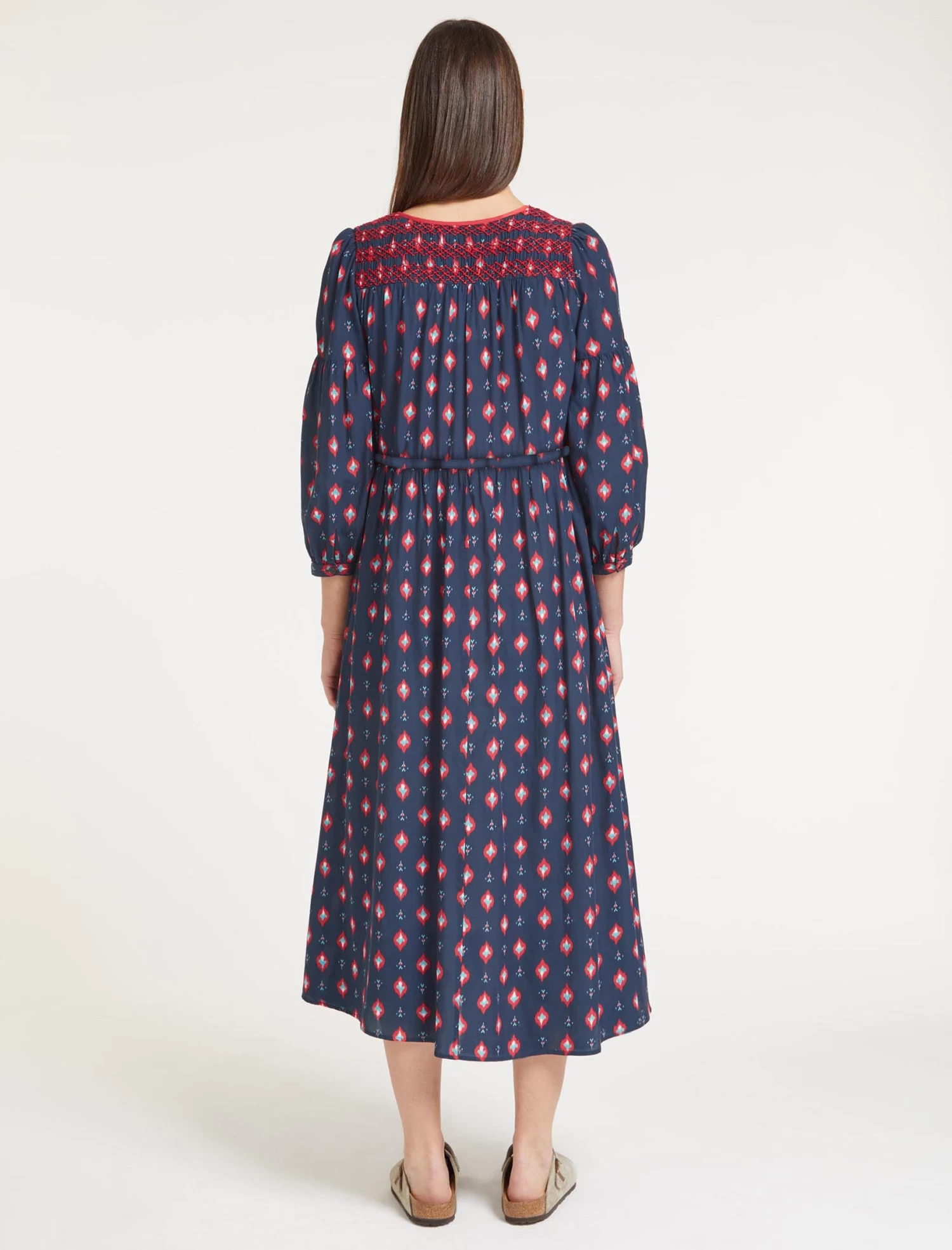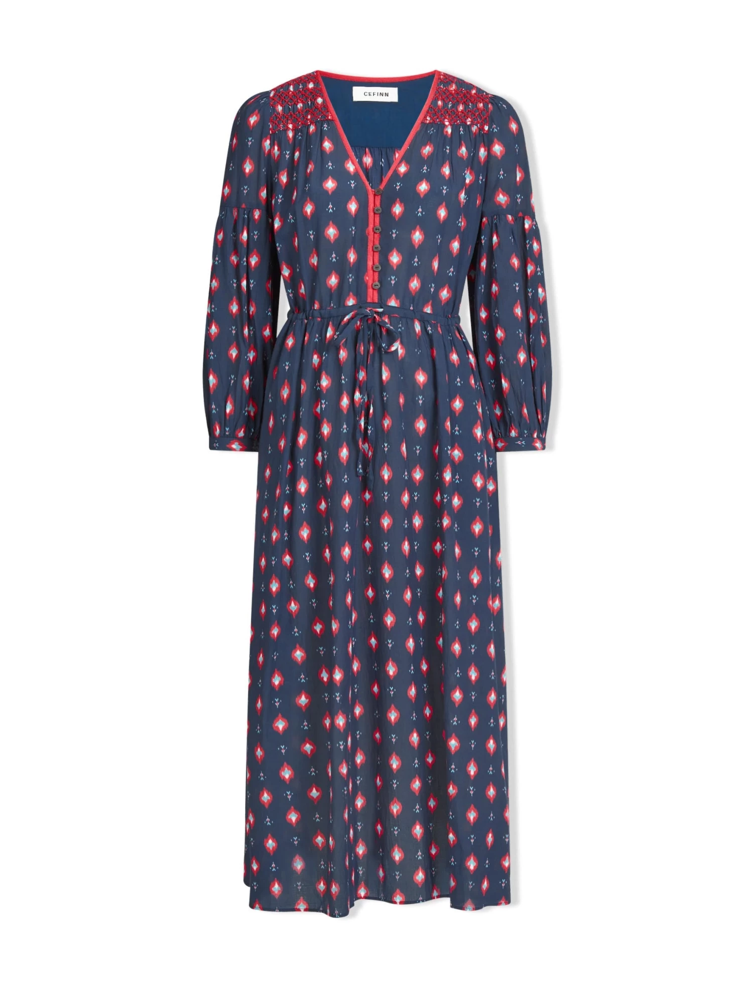 Easy cotton dresses with throw-on-and-go appeal are a mainstay of summer wardrobes. Designed in our graphic Ikat print, Yula ticks all the boxes. Pretty details include the hand-embroidered smocking (a first for Cefinn), rouleaux summarys and a flattering V-neck. Slip-on for long, lazy alfresco lunches or busy off-duty days.